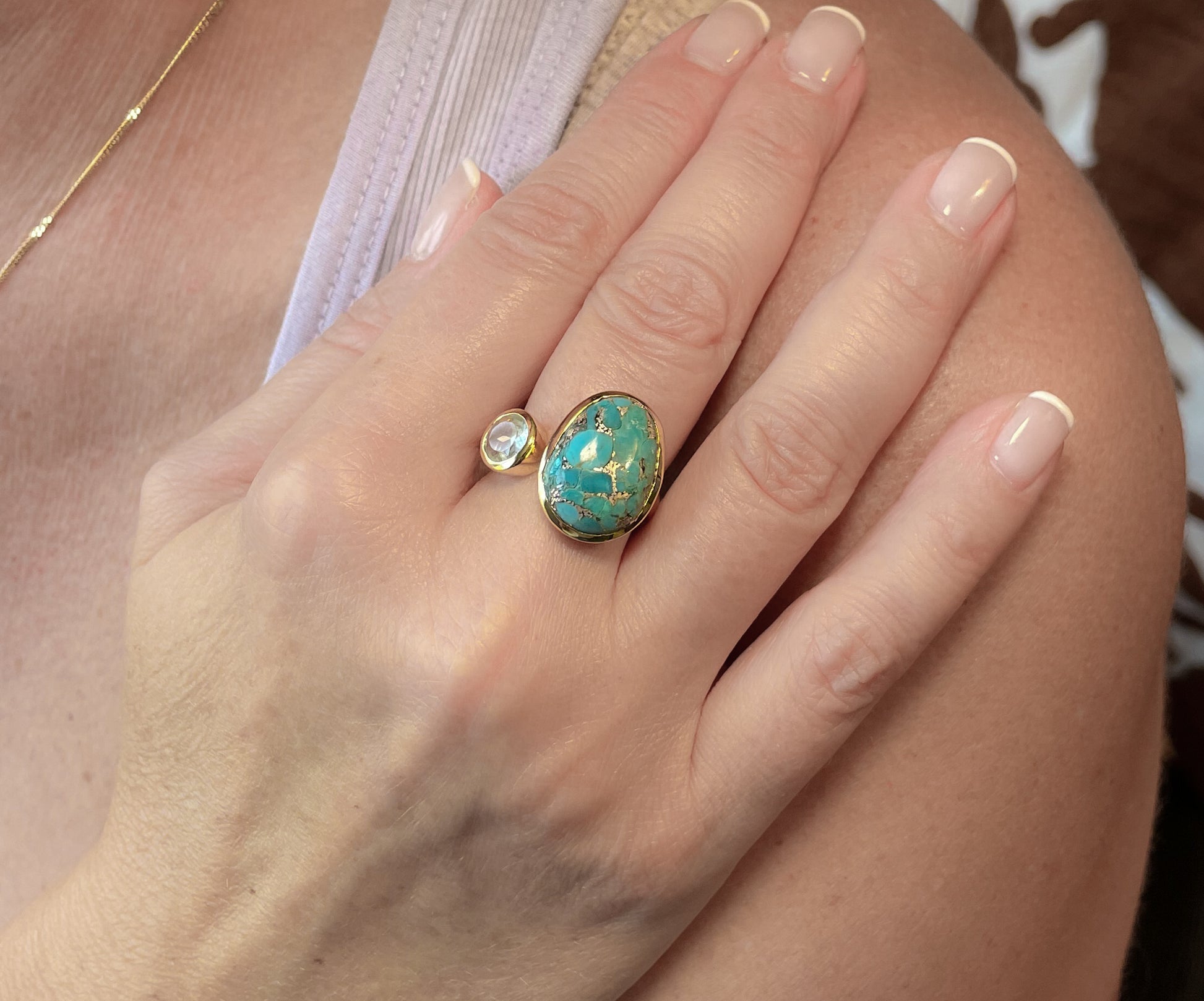 22kt gold plated brass, copper turquoise and blue topaz. Size 7, ring can be adjusted to make it larger.