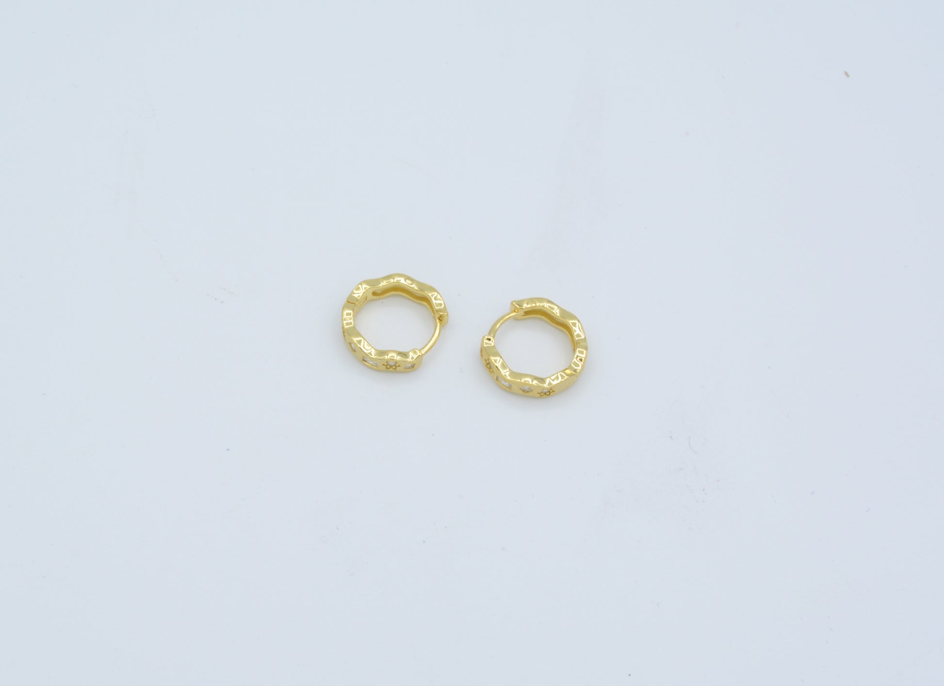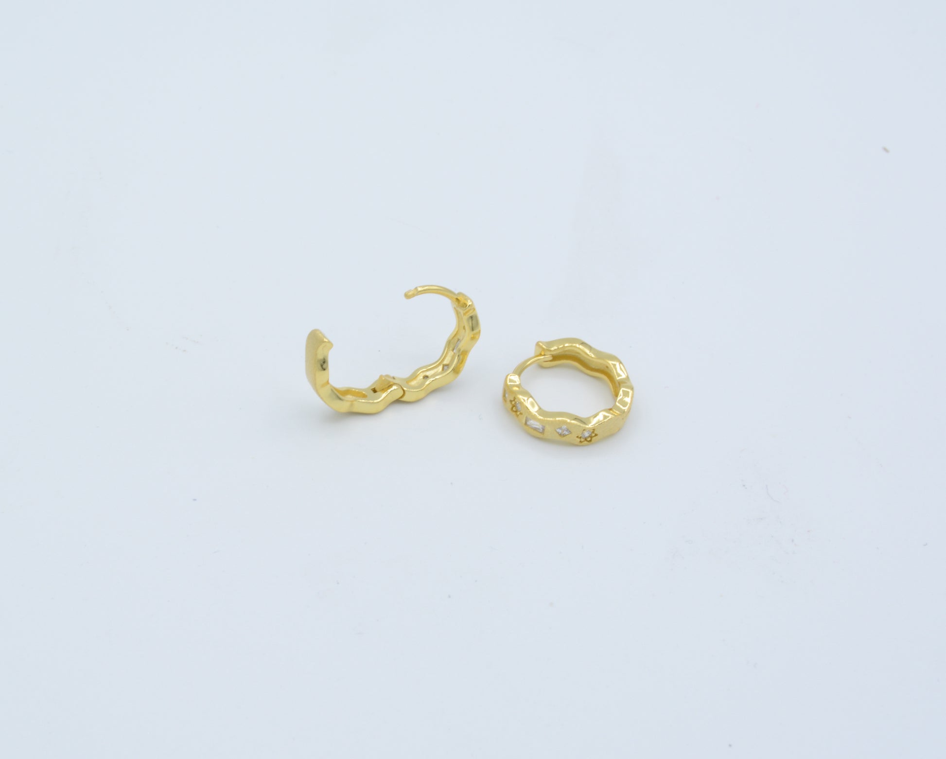 These chic and versatile huggie earrings are designed for a comfortable fit around the earlobe, offering a sleek and modern look perfect for everyday wear or special occasions. Crafted from sterling silver with 14kt brushed gold plating, they feature a secure hinge closure. Adorned with mixed-shaped cubic zirconia accents, including baguette and star cuts, they add a subtle touch of sparkle. Measuring 1/16" in diameter.