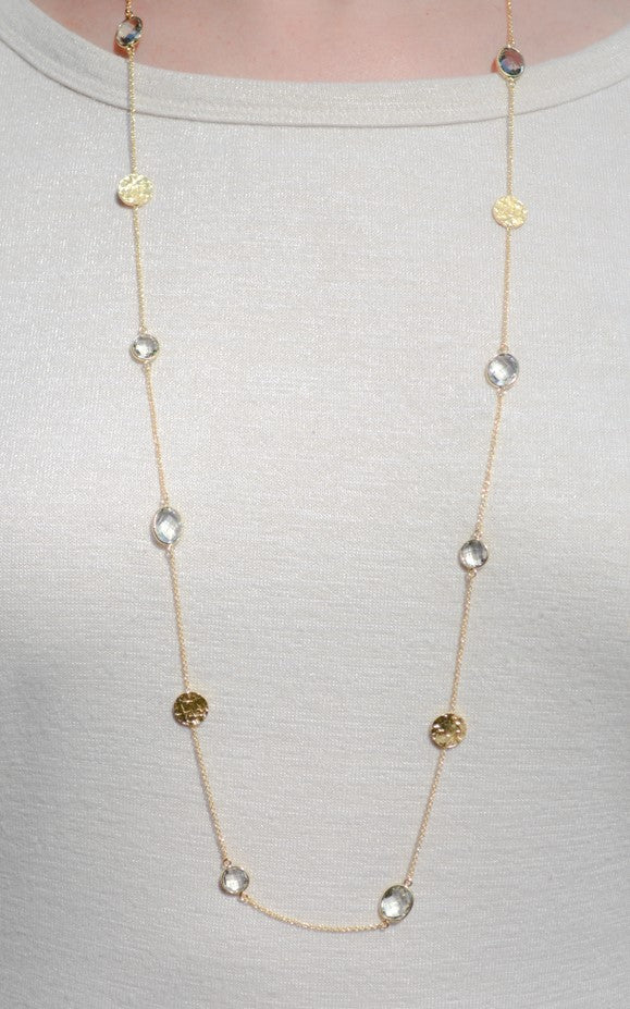 Indulge in luxury with our light green amethyst necklace. Its delicate hue and hammered disc add a touch of sophistication to any outfit. Perfect for layering, the 22k gold over brass chain measures 37" in length, making it an effortless addition to your wardrobe. Elevate your style with this exquisite piece.