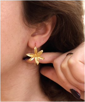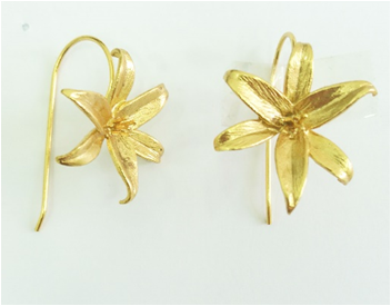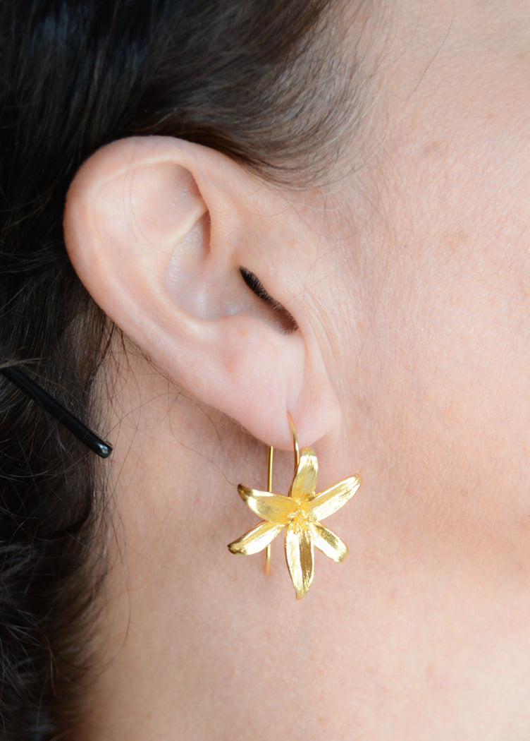 22k gold plated flower earrings. 1 1/4" long. These earrings are artful and timeless. Crafted with an elegant 22k gold plating, they have a finished look that will last.