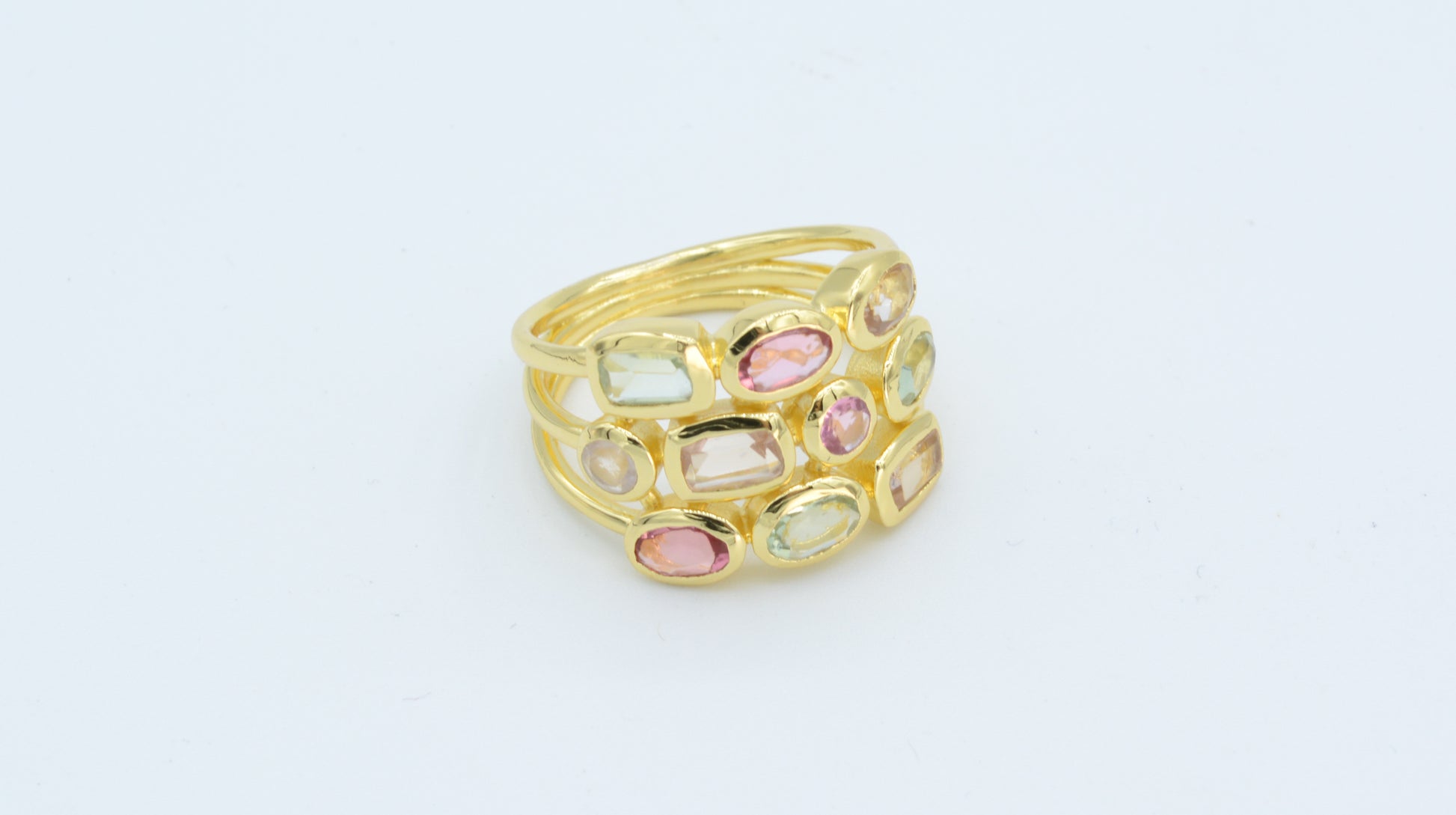This ring combines baguette, oval, and round-shaped stones in a stunning arrangement. Featuring pink tourmaline, green amethyst, and morganite, all set in 22kt gold-plated brass. Like all our rings, it offers a comfortable and perfect fit.