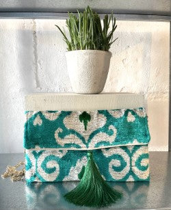 This limited edition handwoven silk and cotton chenille clutch purse features an envelope style and decorative tassel with a hidden magnetic snap closure. Measuring 11x6" and lined in cotton twill, the 22" gold plated removable chain allows you to wear it as a shoulder bag or crossbody. We recommend Scotch Guard prior to wear.