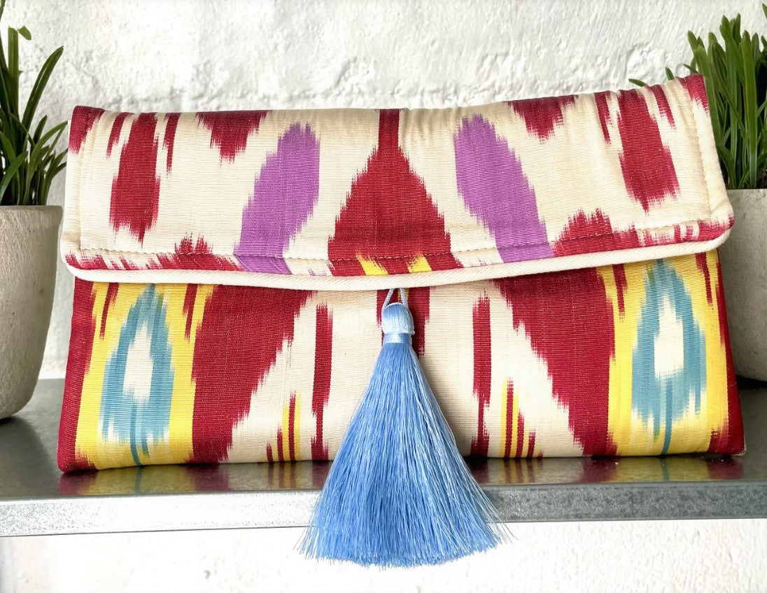 A handwoven, raw silk clutch purse with a decorative tassel, a discreet magnetic snap closure, and a removable gold-plated chain comprise this limited edition piece. At 11x6", this bag is lined with cotton twill and features a chain of 22" in length, allowing it to be worn as a shoulder bag or crossbody. To ensure longevity, we recommend Scotch Guard prior to use.