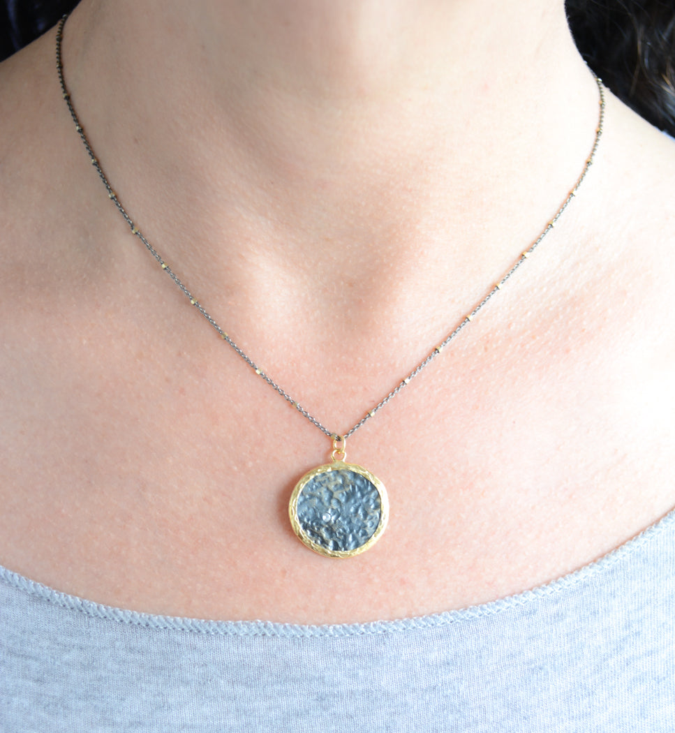 This customer-beloved hammered bronze disc features a 22kt gold-plated bezel setting with a single offset cz accent. For a pop of contrast and elegance, we've paired it with a 2-tone dark rhodium chain featuring 22kt gold-plated accents. The pendant measures approximately 3/4" in diameter, and the chain is adjustable from 16-18".