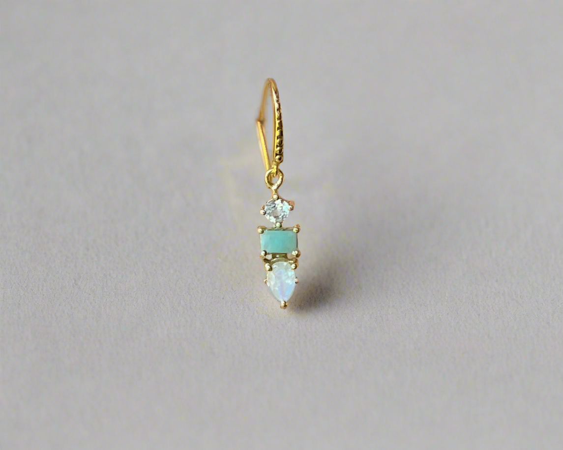 These pretty earrings are neutral enough to wear daily. 22kt gold plated brass with faceted blue topaz, rainbow moonstone, and aqua chalcedony. 1 1/4" length.