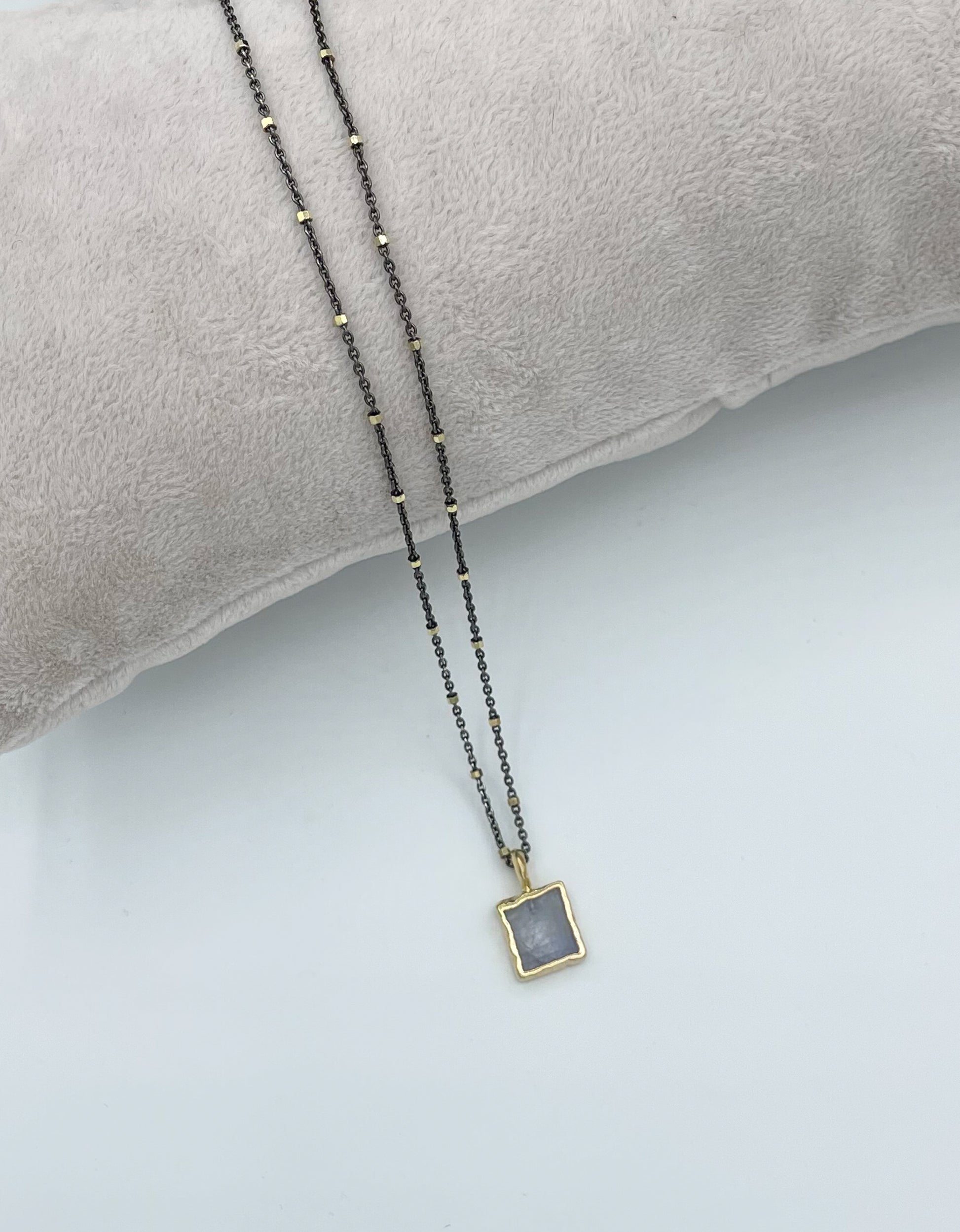 This two-tone necklace features a 22 karat gold and dark rhodium plated silver adjustable chain of 16 to 18 inches in length, complete with a stunningly beautiful Rainbow Moonstone square pendant measuring approximately half an inch. A perfect choice to be worn alone or as part of a layered look.