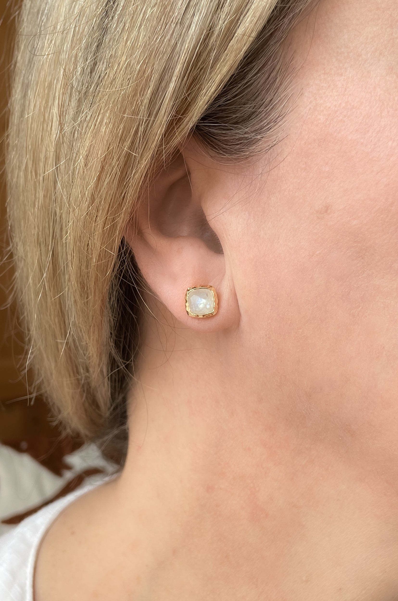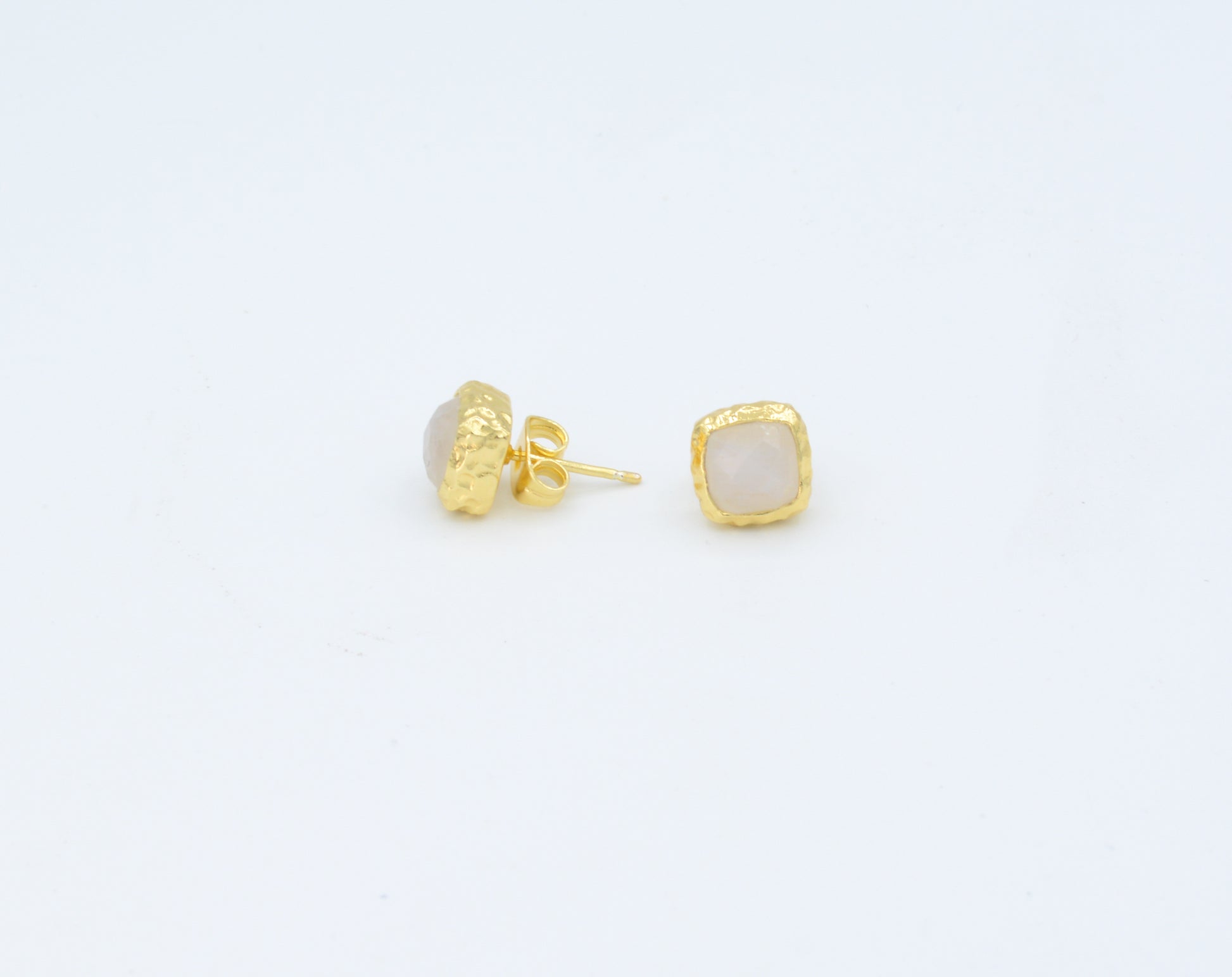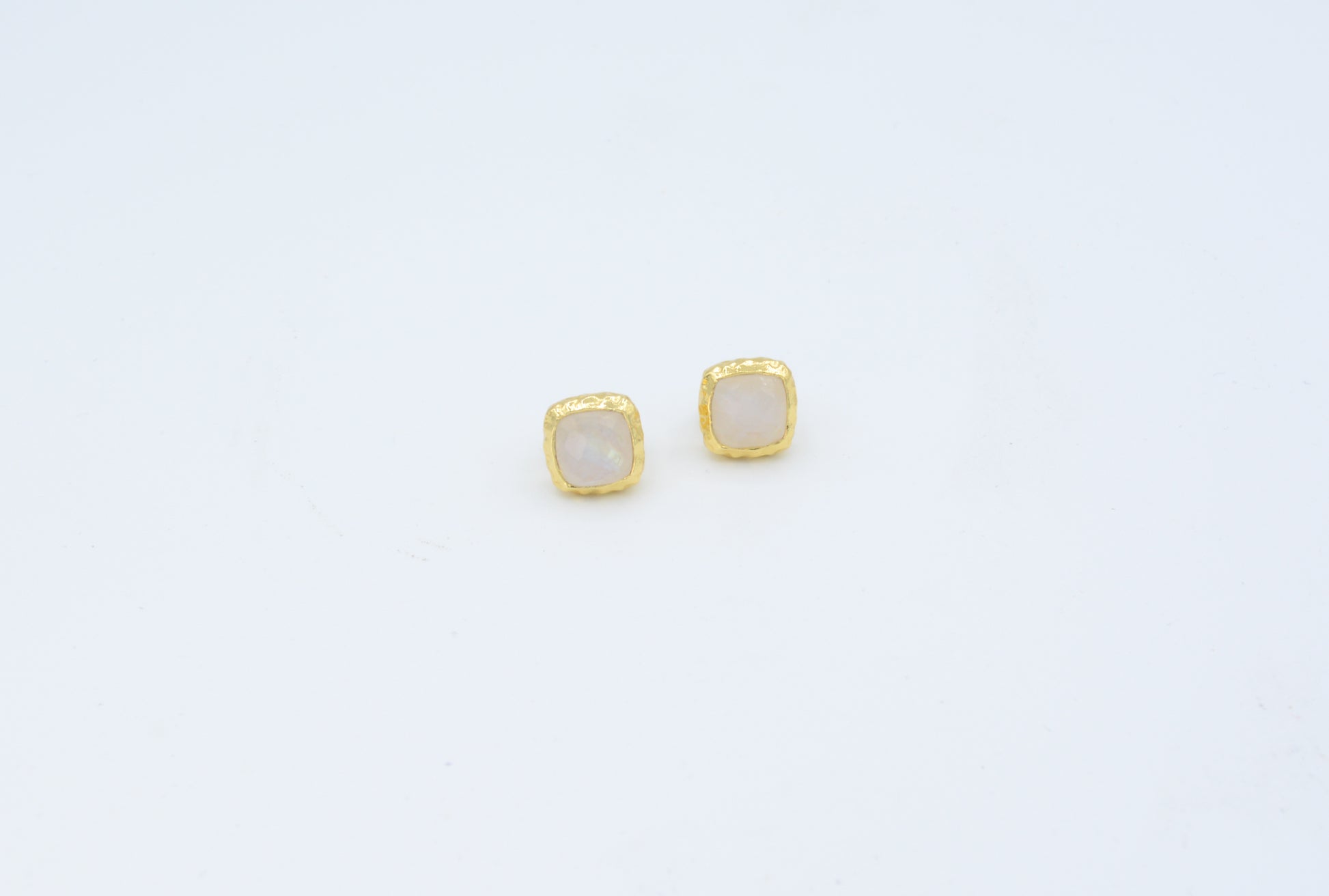 These square-shaped rainbow moonstone studs are crafted from brass with a 22kt gold plating. The hand-hammered setting adds a subtle, organic texture. Each stone is faceted, enhancing its brilliance. The earrings measure 1/4" square