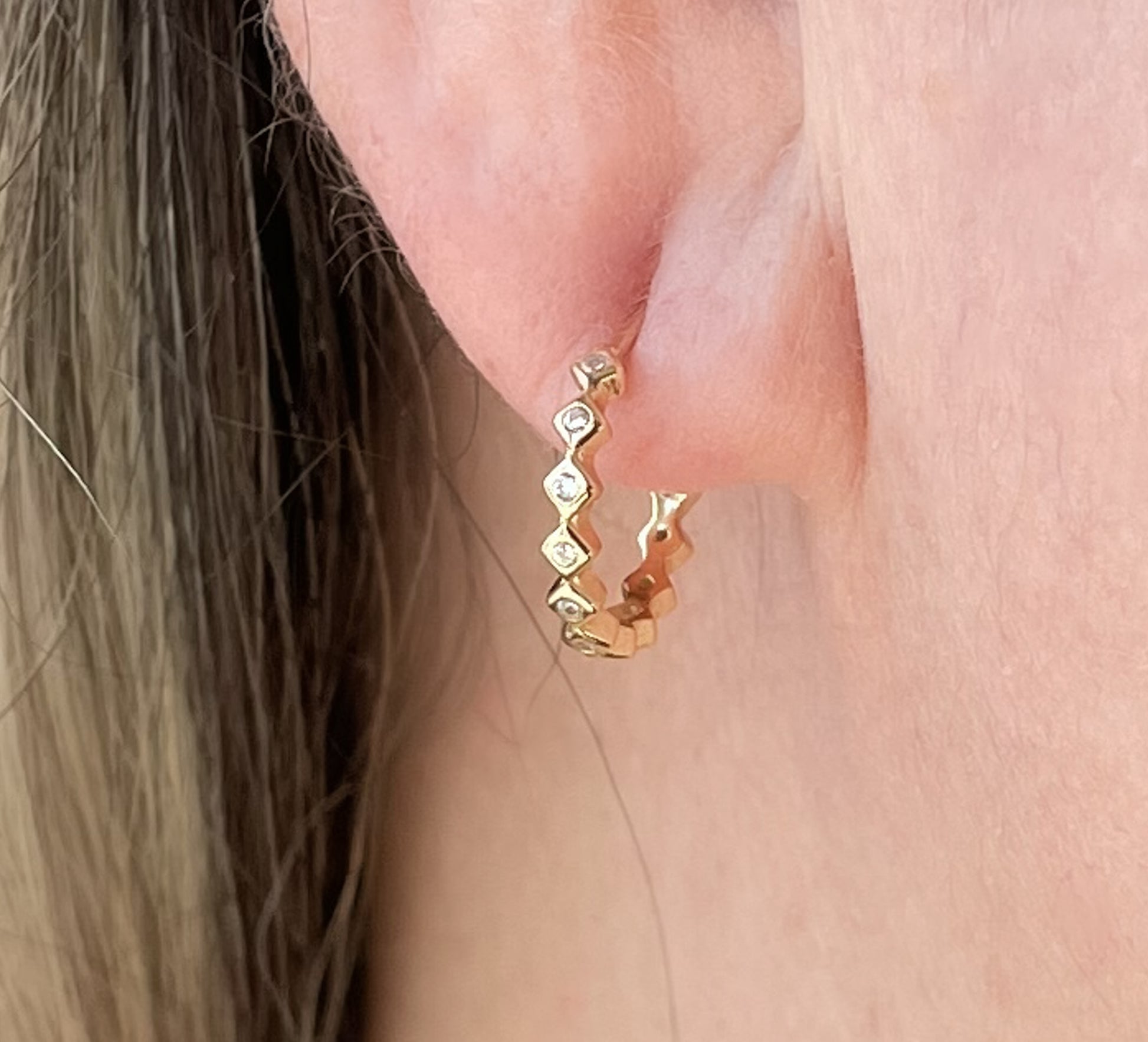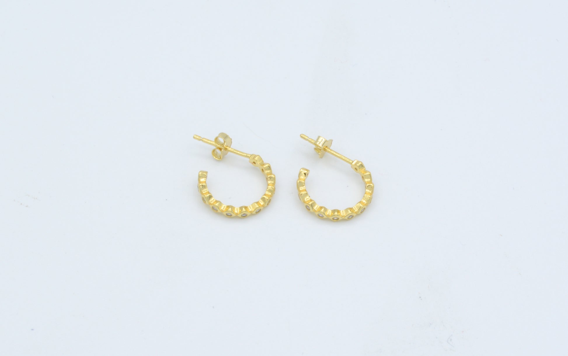 Tiny hoops, big sparkle. These ultra-mini huggie-style earrings are crafted from sterling silver and finished with a luxe 14kt gold plating. Set with shimmering cubic zirconia, they catch the light with every turn. With a diameter of less than 1/16", they offer a snug, barely-there fit—perfect for second piercings or adding a touch of shine to your everyday stack. Lightweight, elegant, and endlessly versatile