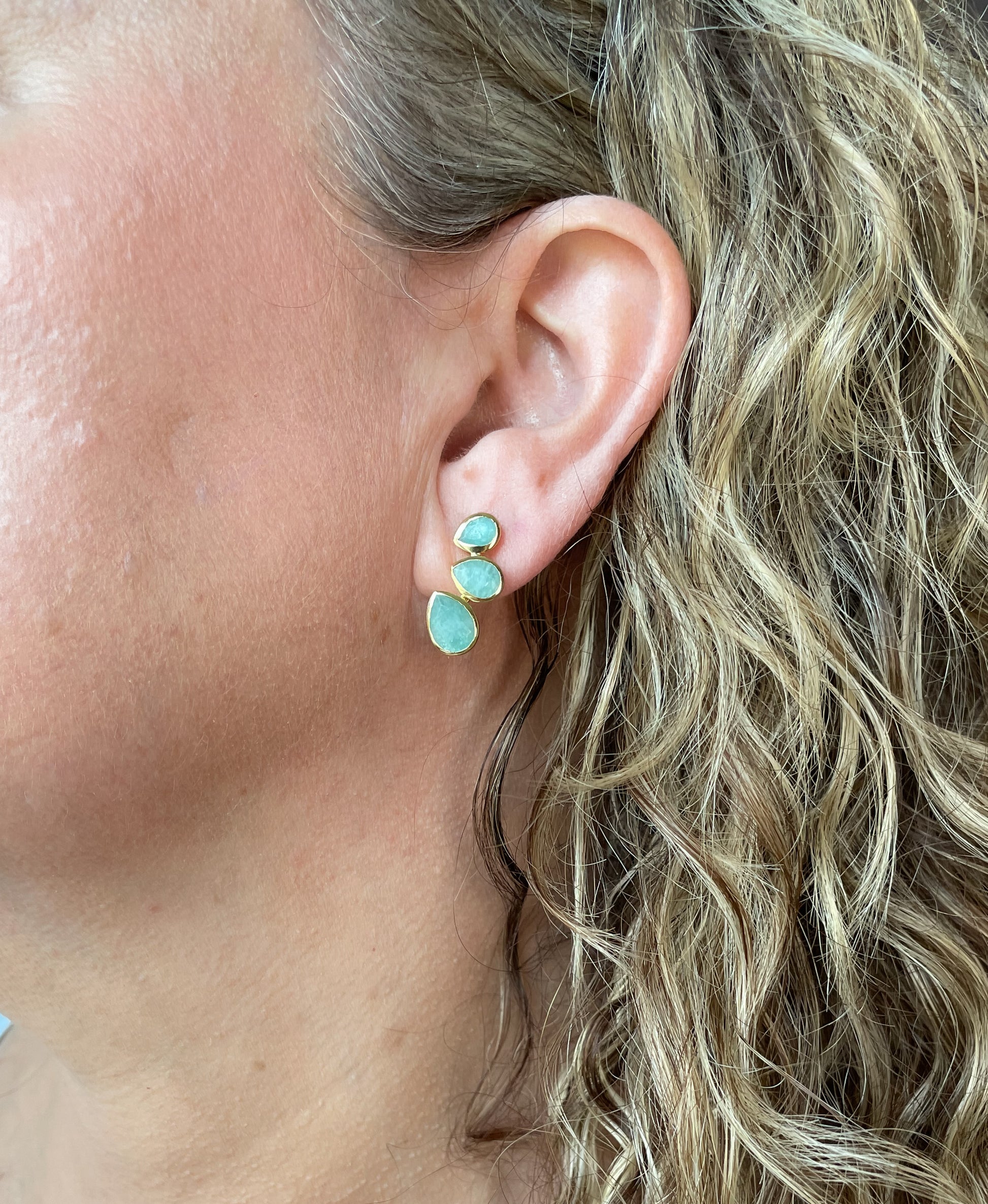 Stunning 18kt gold plated brass earrings with captivating amazonite stones. Elegant 3/4" length, perfect for any occasion. Enhance your style effortlessly!