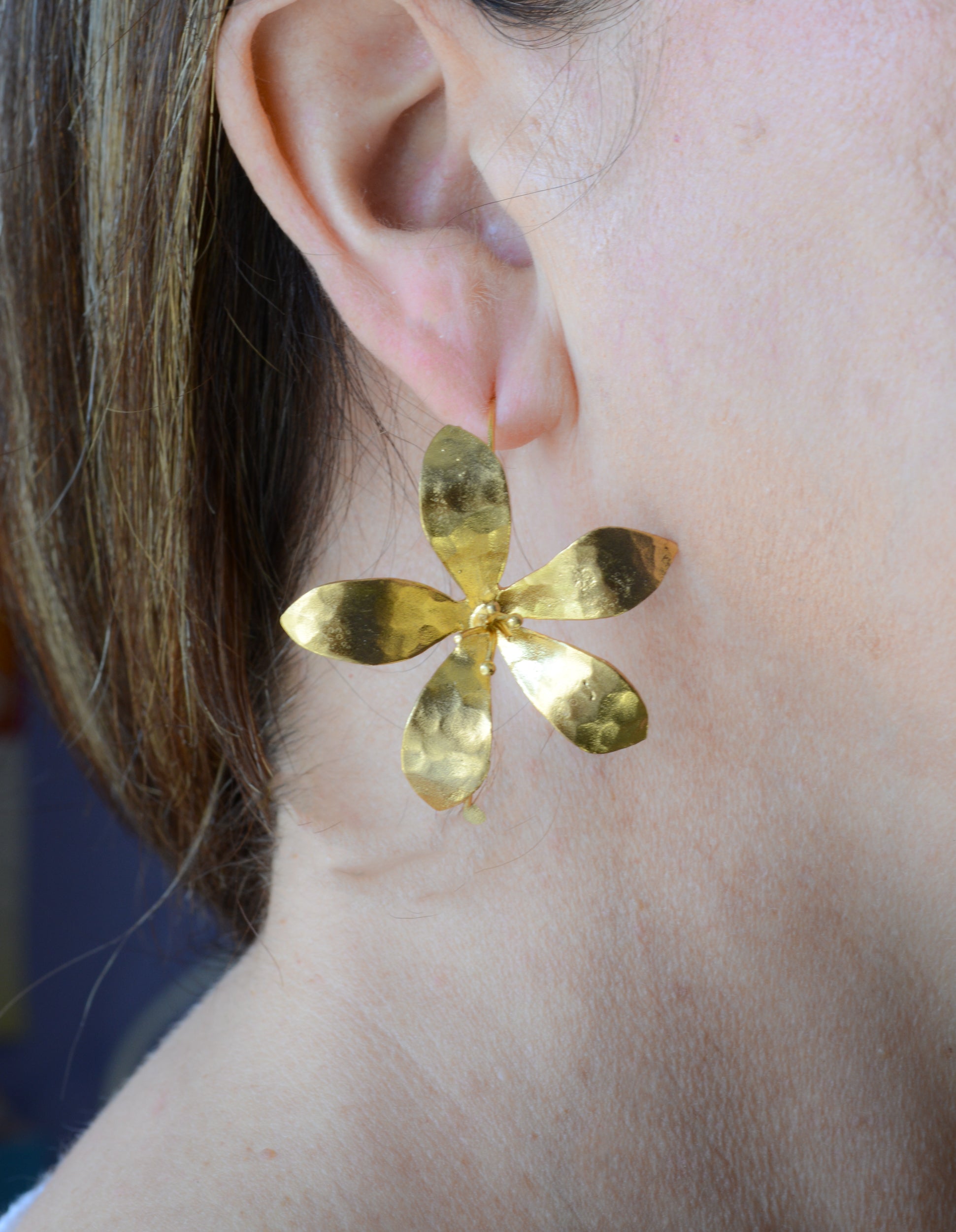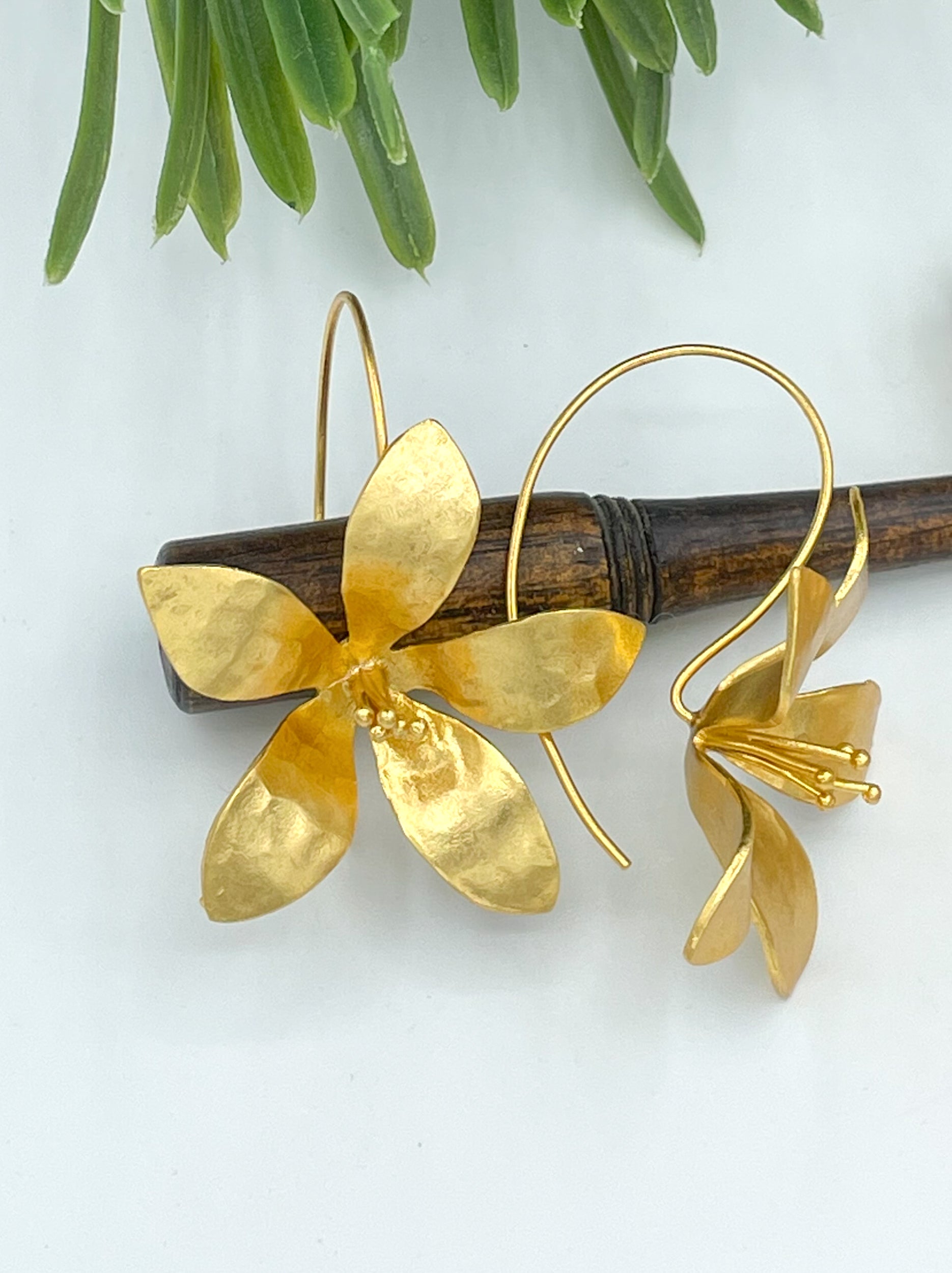 These statement earrings feature a popular flower design, now enlarged for a bold look. Crafted with 22k gold plating, these earrings are approximately 2" long and 1 1/2" wide for a stunning addition to any outfit.