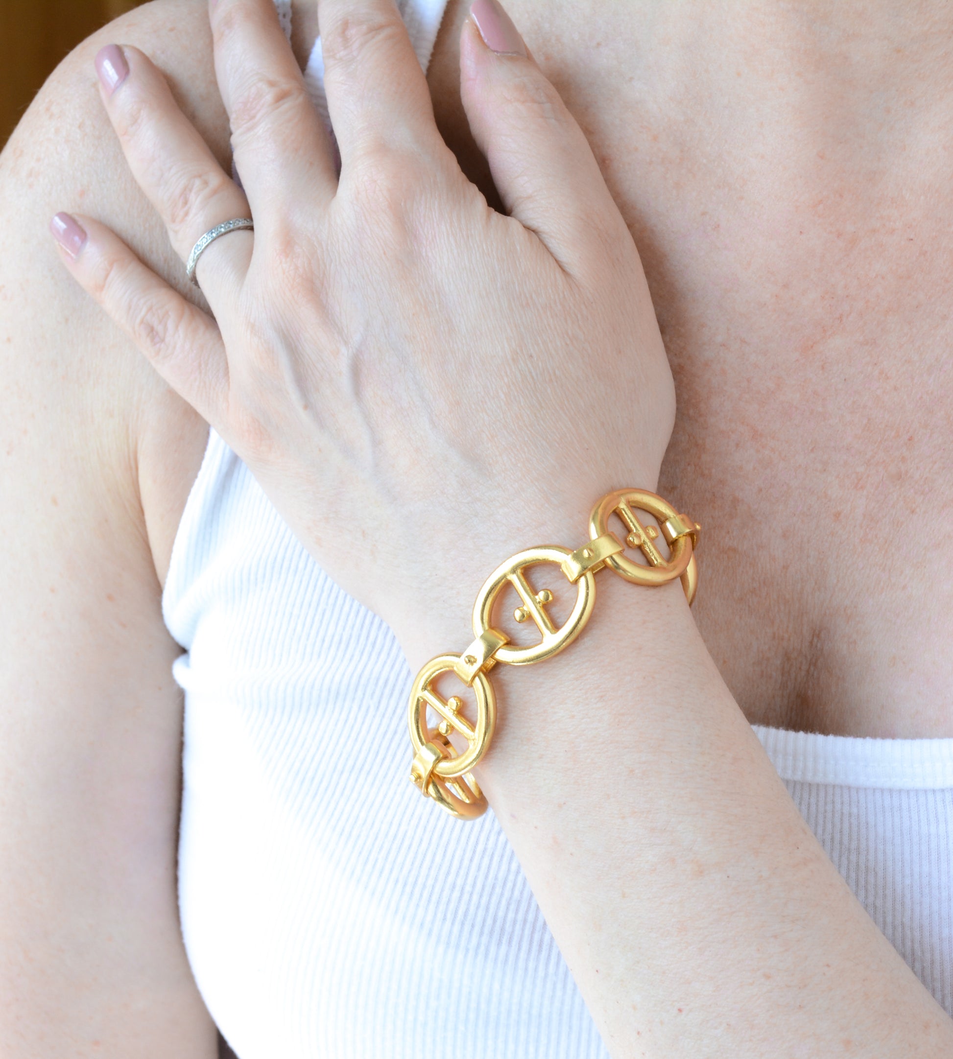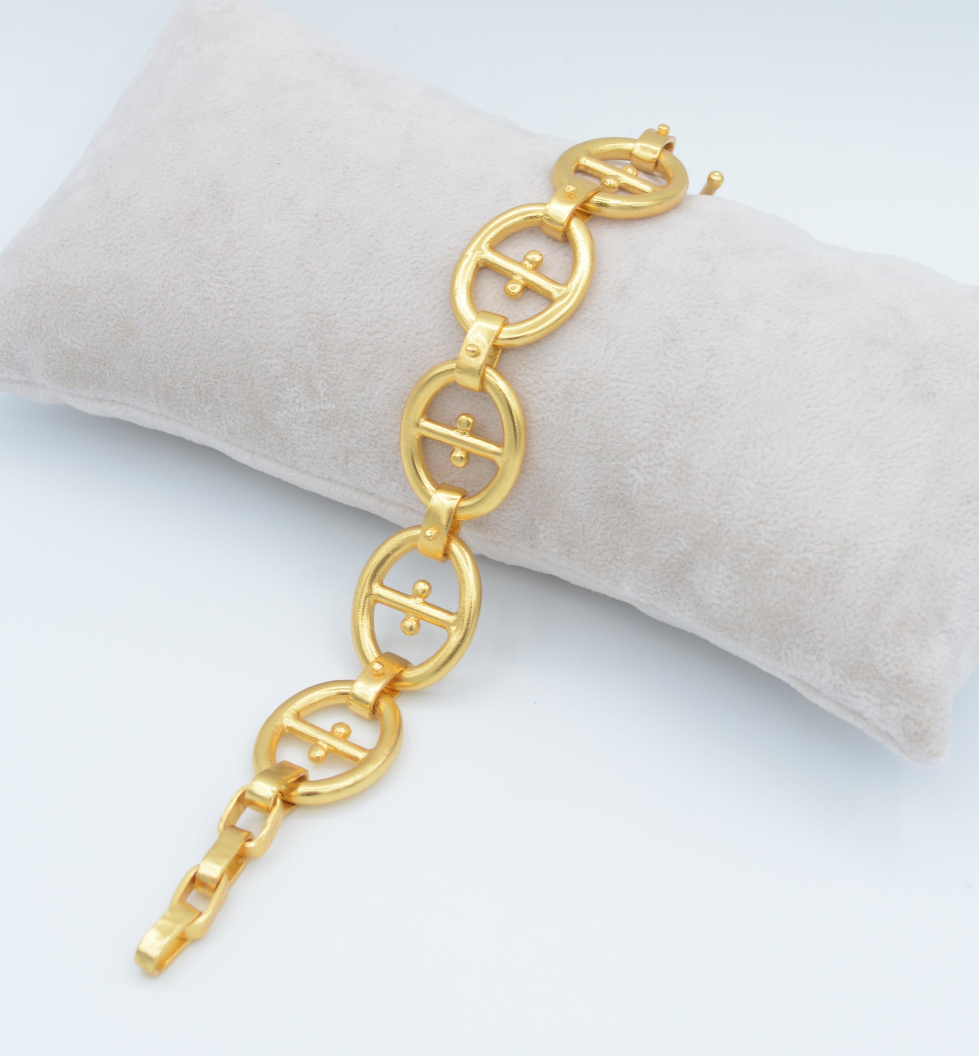 This stylish bracelet is inspired by ship anchor chain. Handmade chain is made with brass and plated with 22kt gold. Adjustable 6 1/2-8"