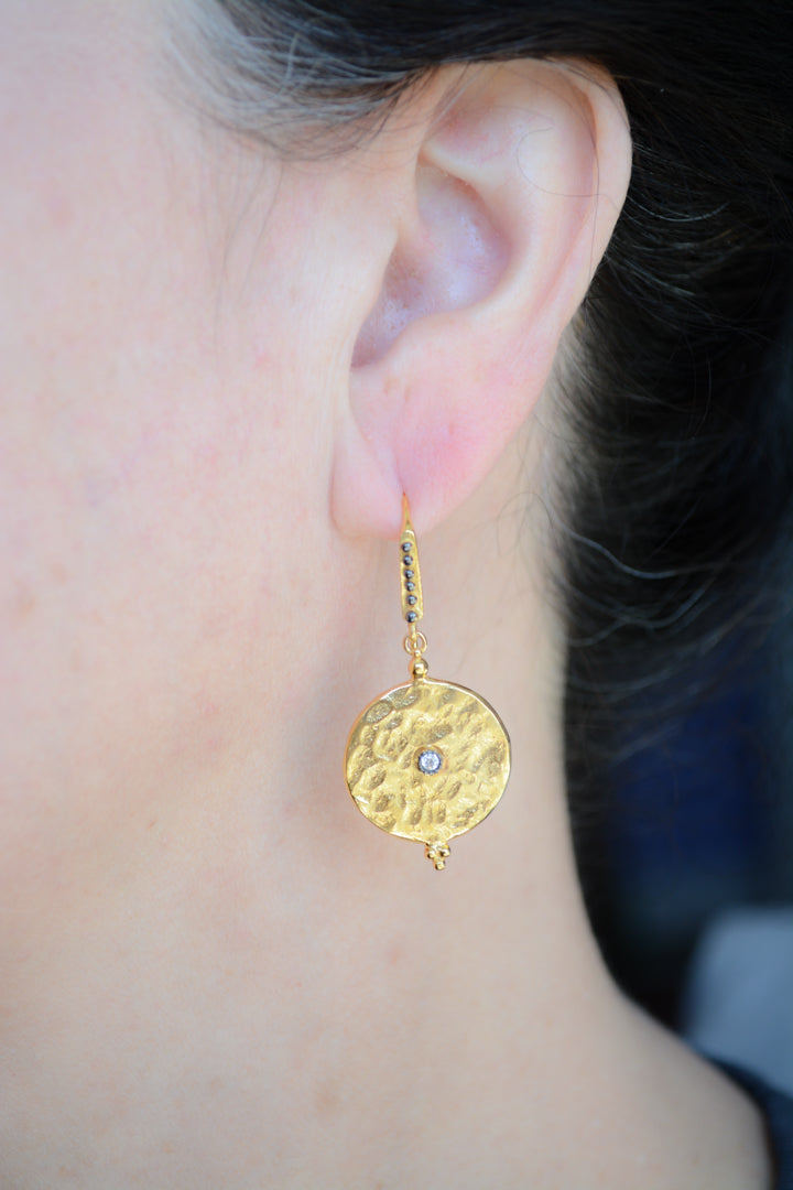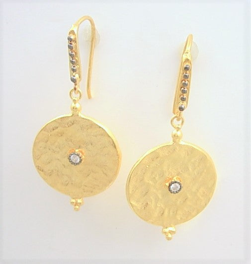 Our popular contemporary hammered drop earrings are very versatile. Made with brass, and plated with 22kt gold. Cubic zirconia, and contrasting oxidized beading elevate the design. Approximately 1 3/4" long. These earrings will enhance every outfit.