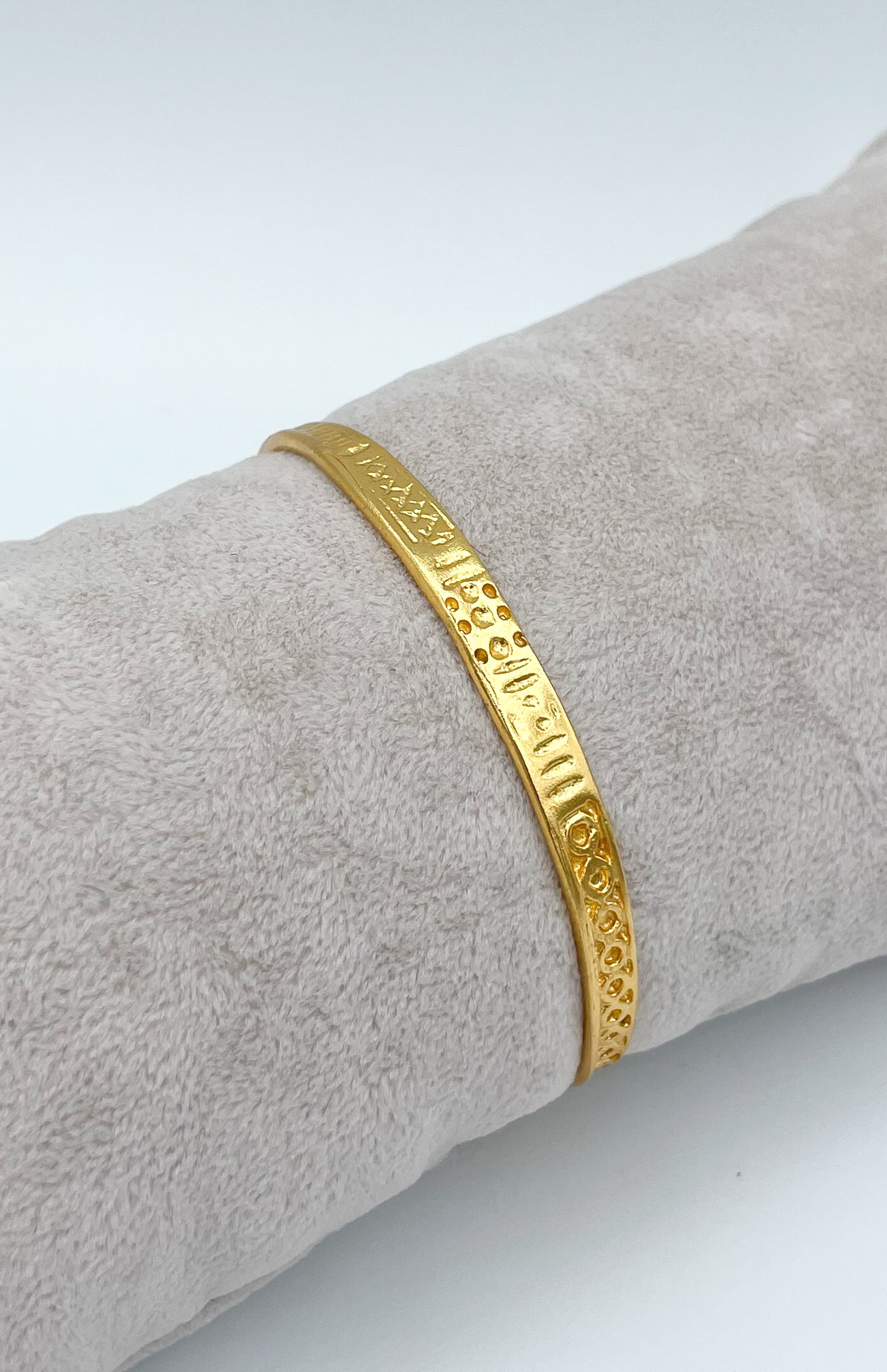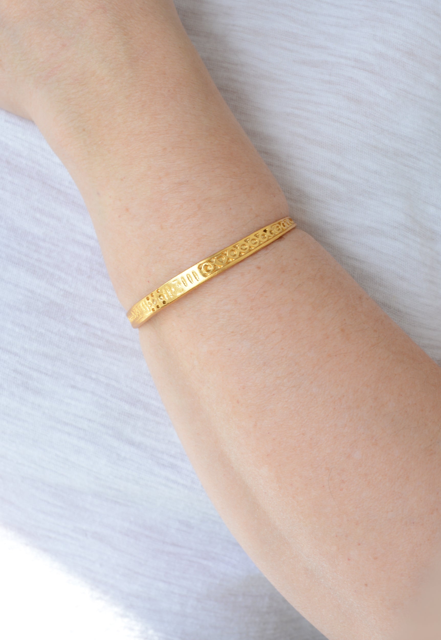 This artisanal cuff is crafted from brass and plated with 22 karat gold, delivering a one-size-fits-most solution.