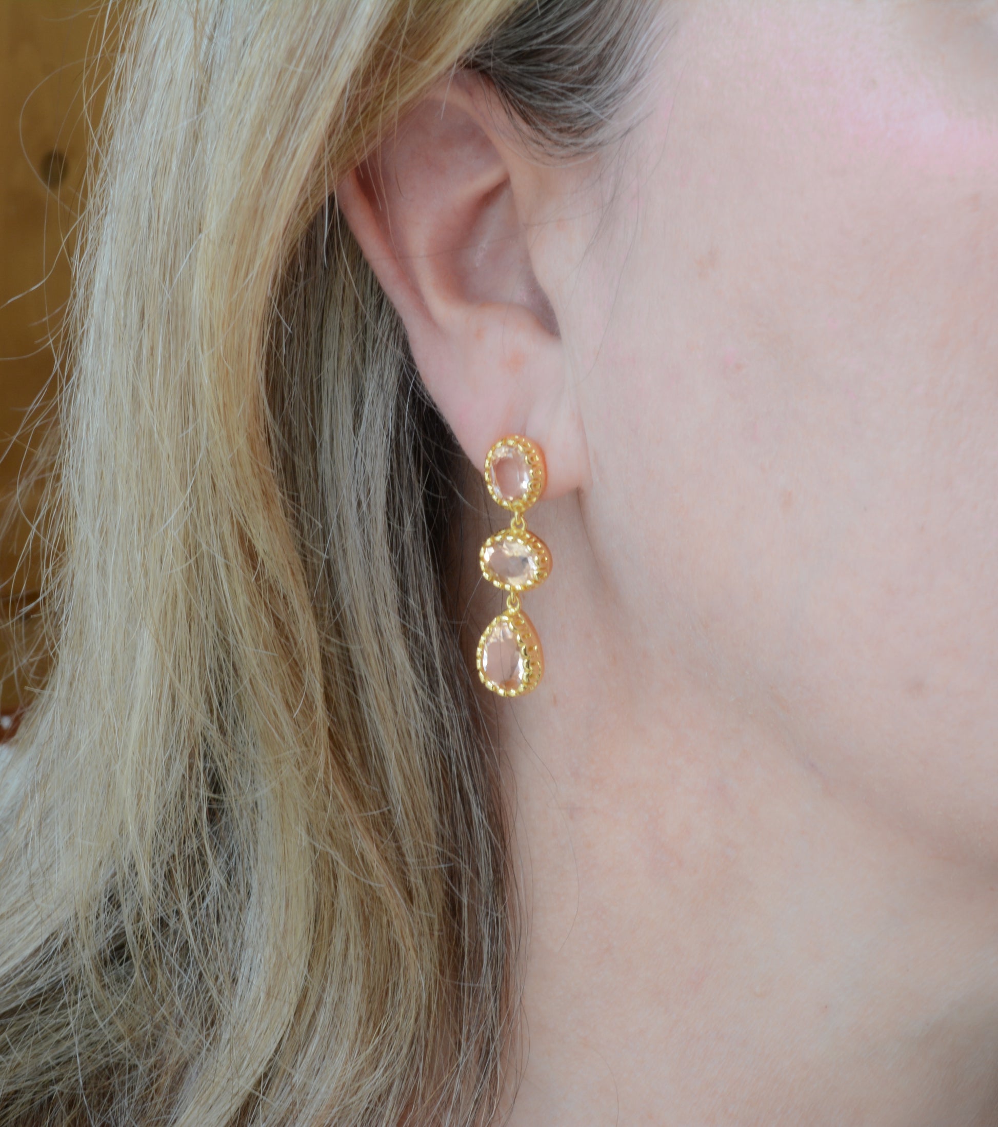 Morganite showcases a distinctive hue that blends peach and pink tones. This design features a combination of oval and pear-shaped stones, elegantly set in brass with 22kt gold plating. Lightweight and comfortable to wear, the earrings measure 1 1/4" in length.