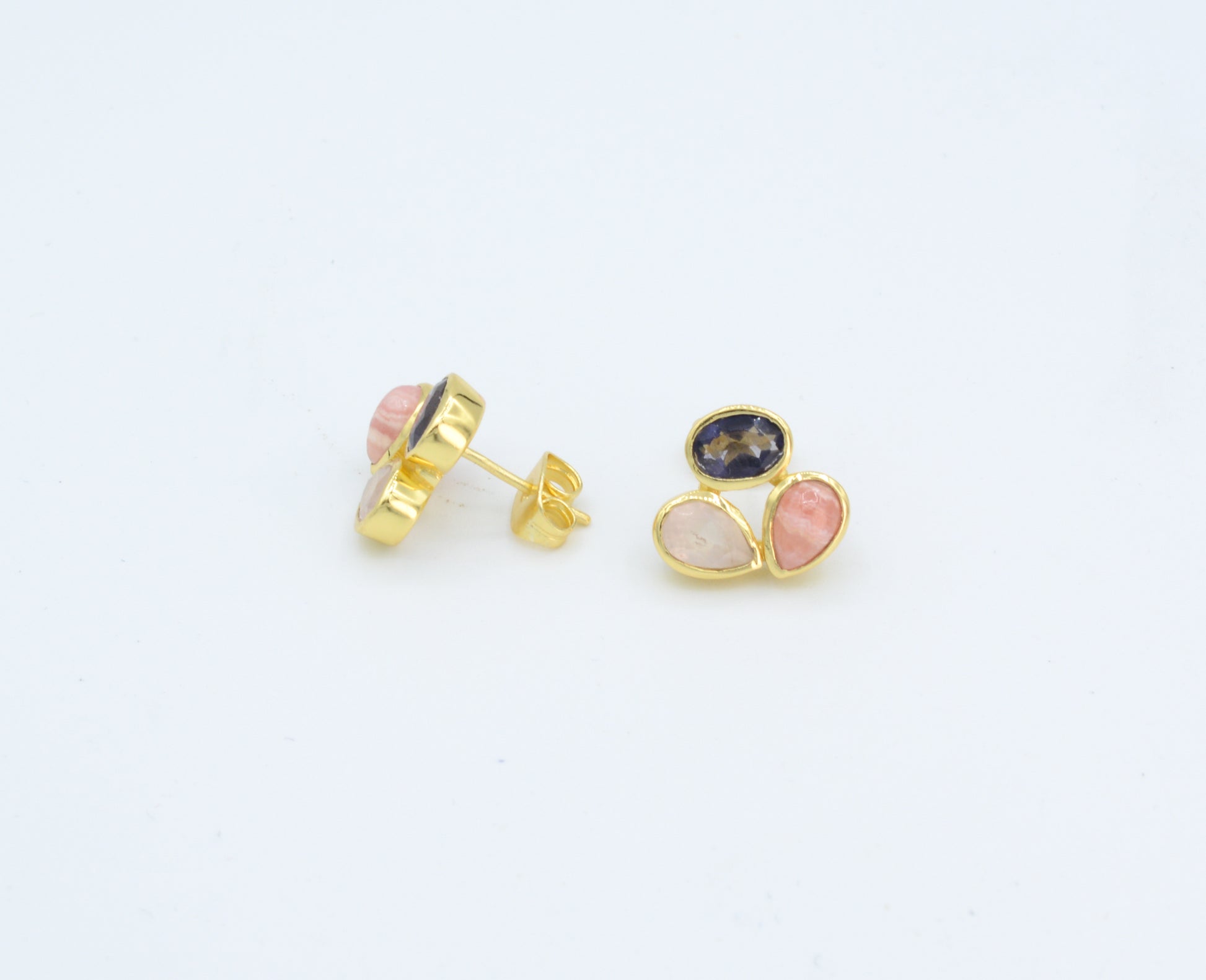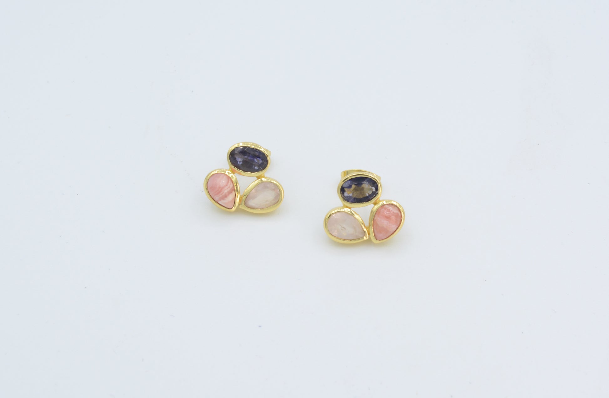 Great combination of Iolite, rose quartz, and rhodochrosite adorns these earrings. Set in 22kt gold plated brass. They can be worn daily as well as for a special occasion. Less than 1/2" in diameter.