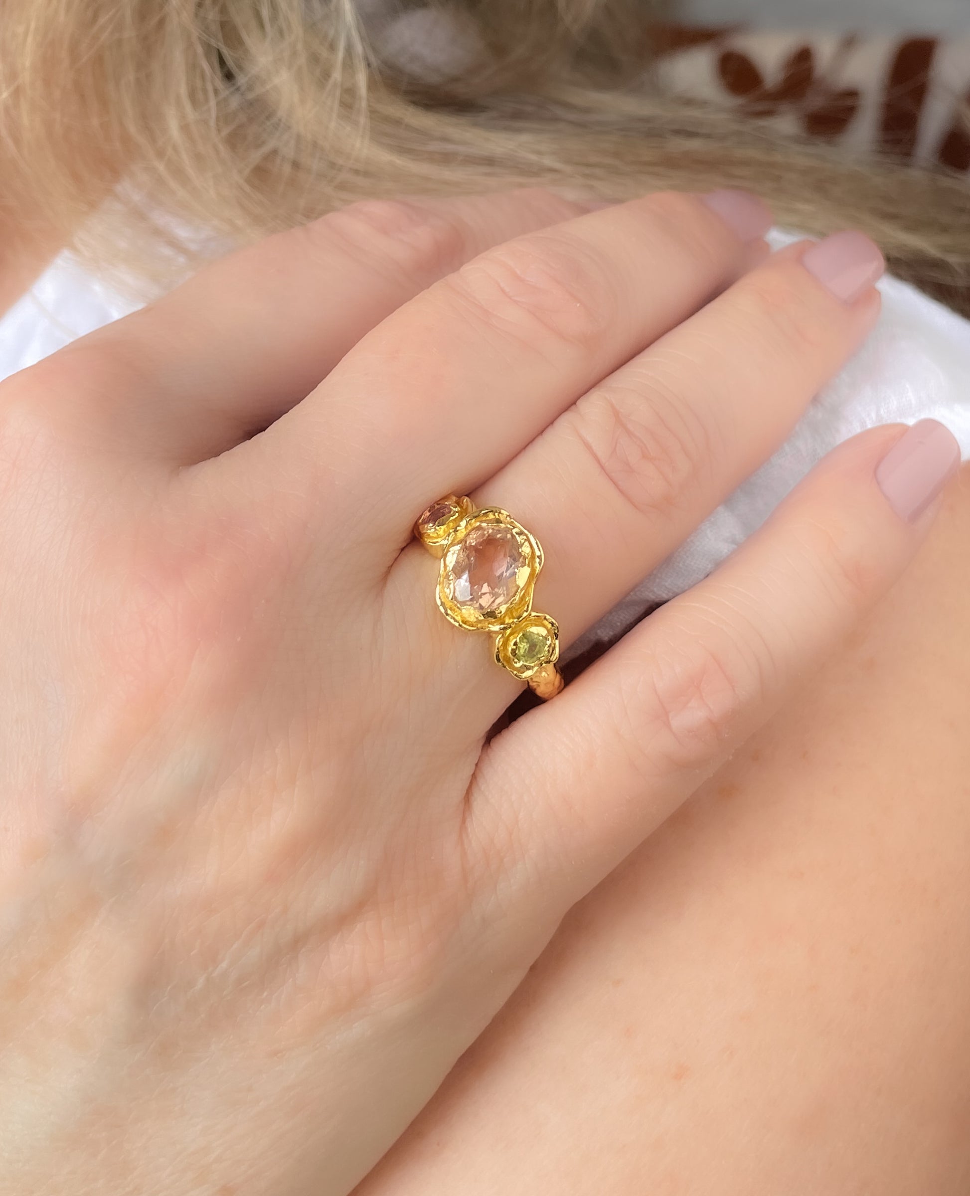 This ring boasts an exquisite organic design, crafted with exceptional attention to detail. Set in 22kt gold-plated brass, it features stunning morganite, peridot, and pink tourmaline stones, making it truly special.