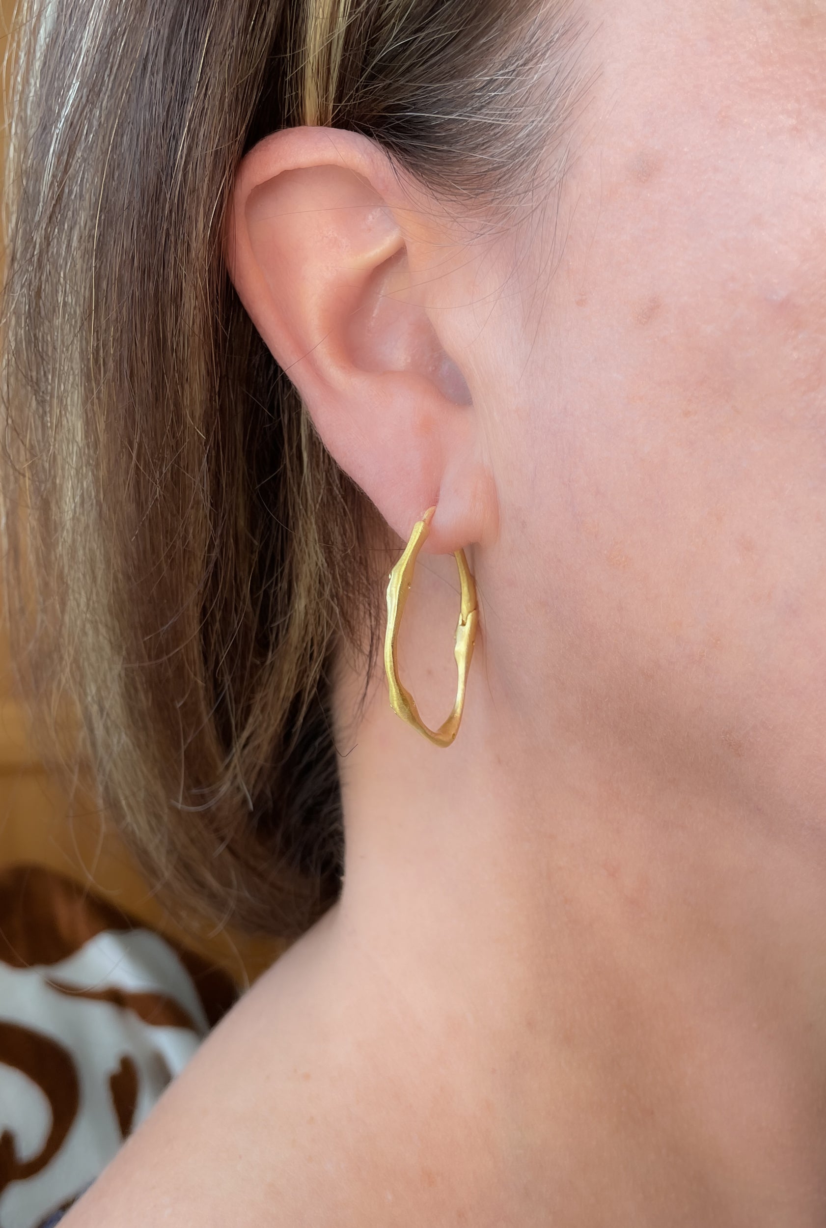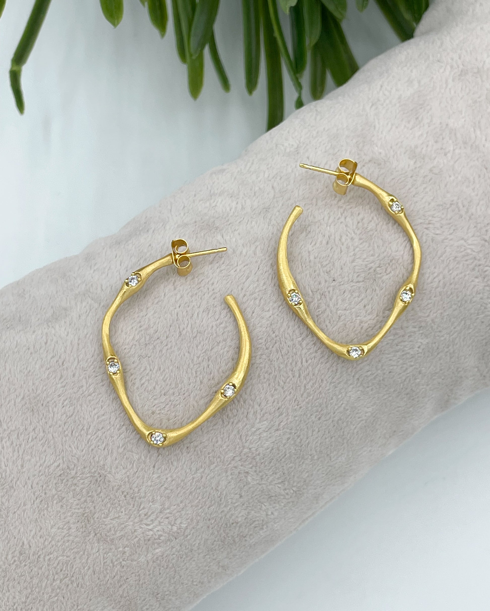 Indulge in the exquisite beauty of our handmade brass earrings, plated with 22kt gold for a luxurious touch. Featuring a unique matte finish and delicate hoop design with post, these earrings are both elegant and lightweight for comfortable wear. The outward facing cubic zirconia accents add a touch of sparkle to complete this organic-inspired look. 1.5" height.