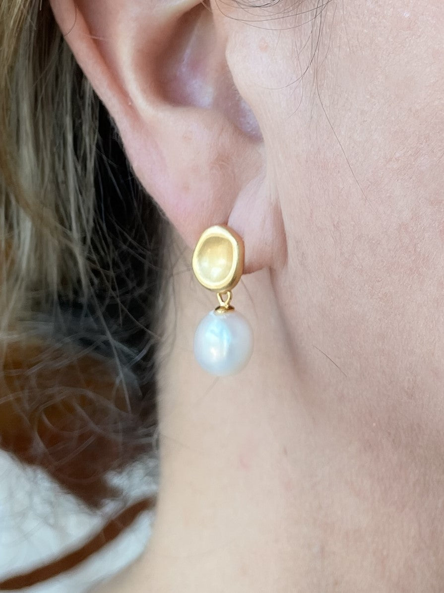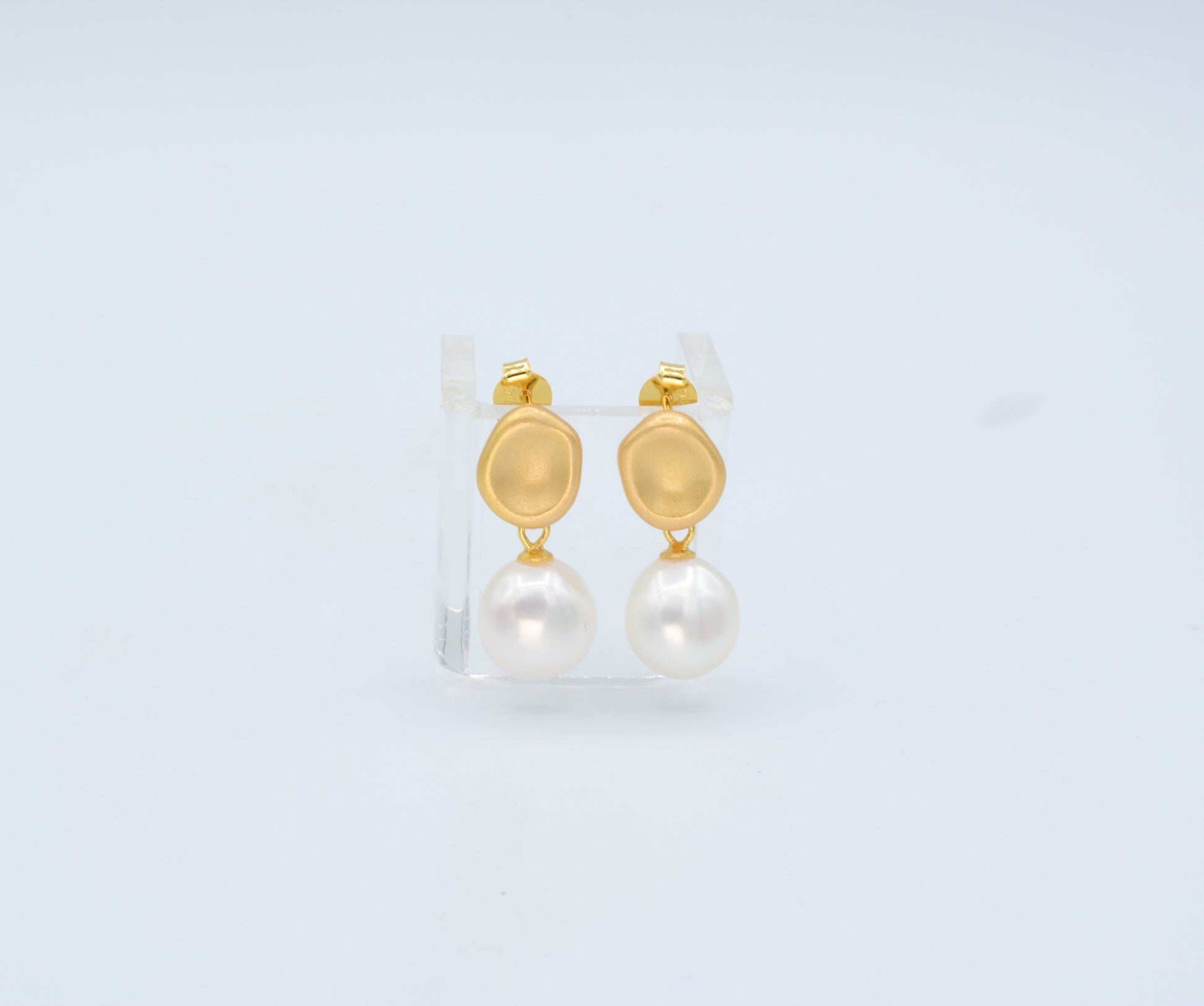 Our classic, and sophisticated genuine pearl earrings are sure to be a customer favorite, Crafted of sterling silver with 14kt gold plate and a matte finish. Approximately 3/4" long.