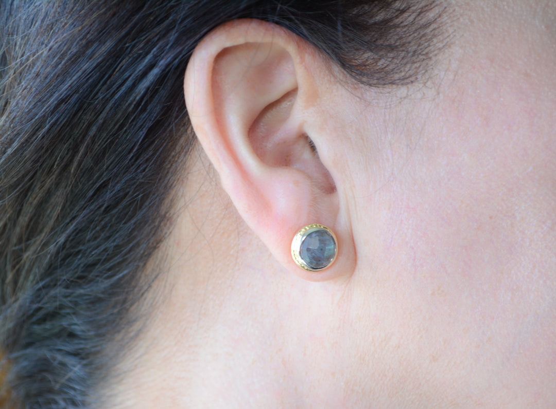 These 22kt gold plated, rhodium, and brass stud earrings feature faceted labradorite stones, with each stone measuring 0.4" in diameter.