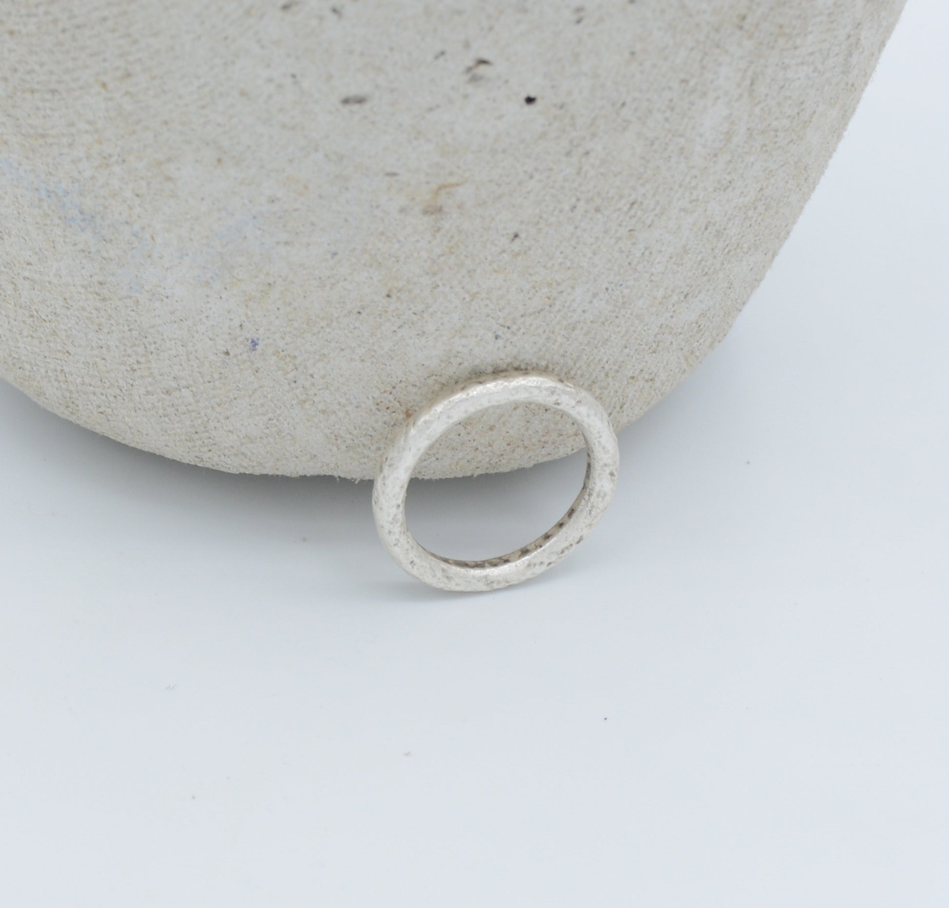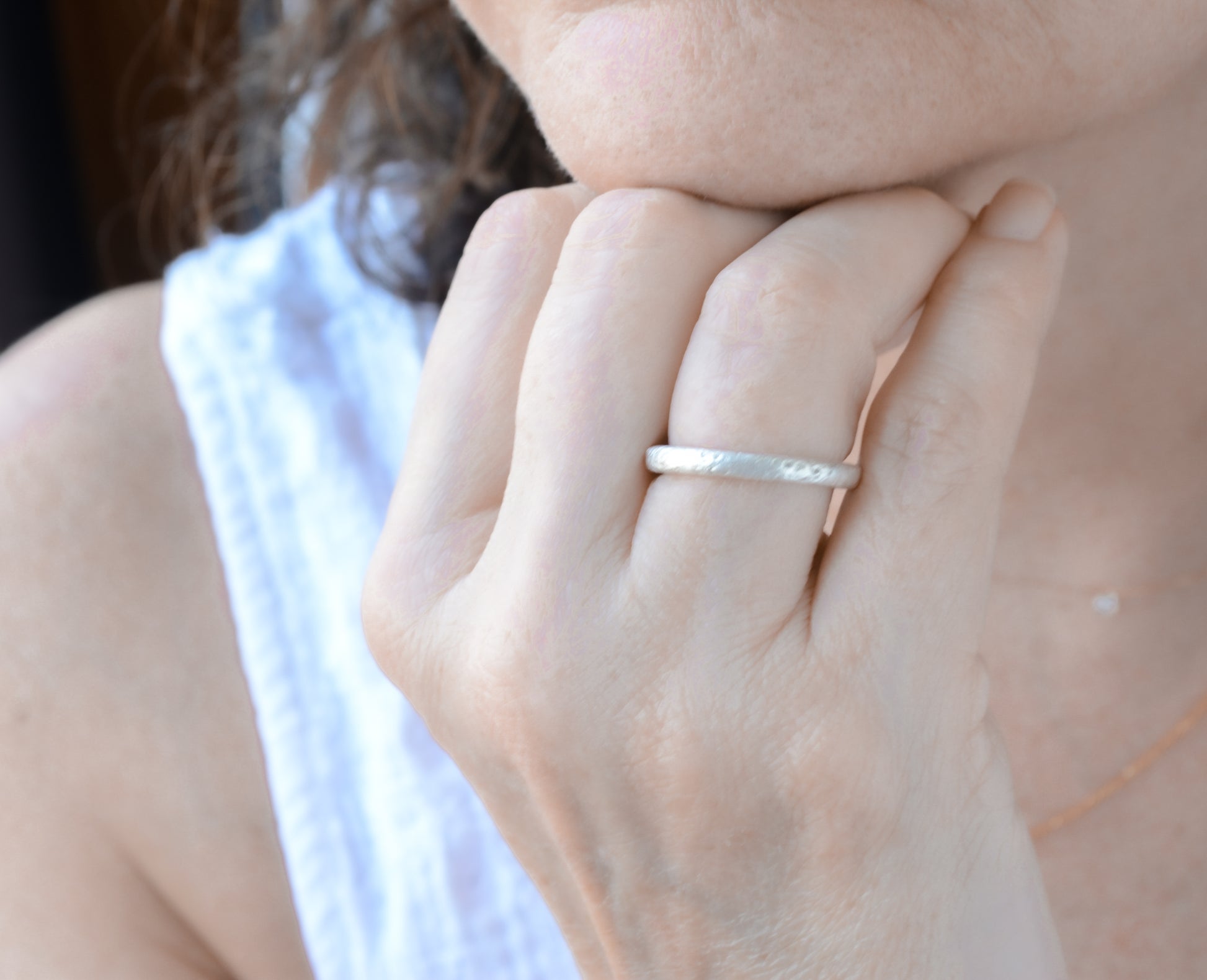 Our hand textured band ring is made out of brass and plated with rhodium.