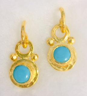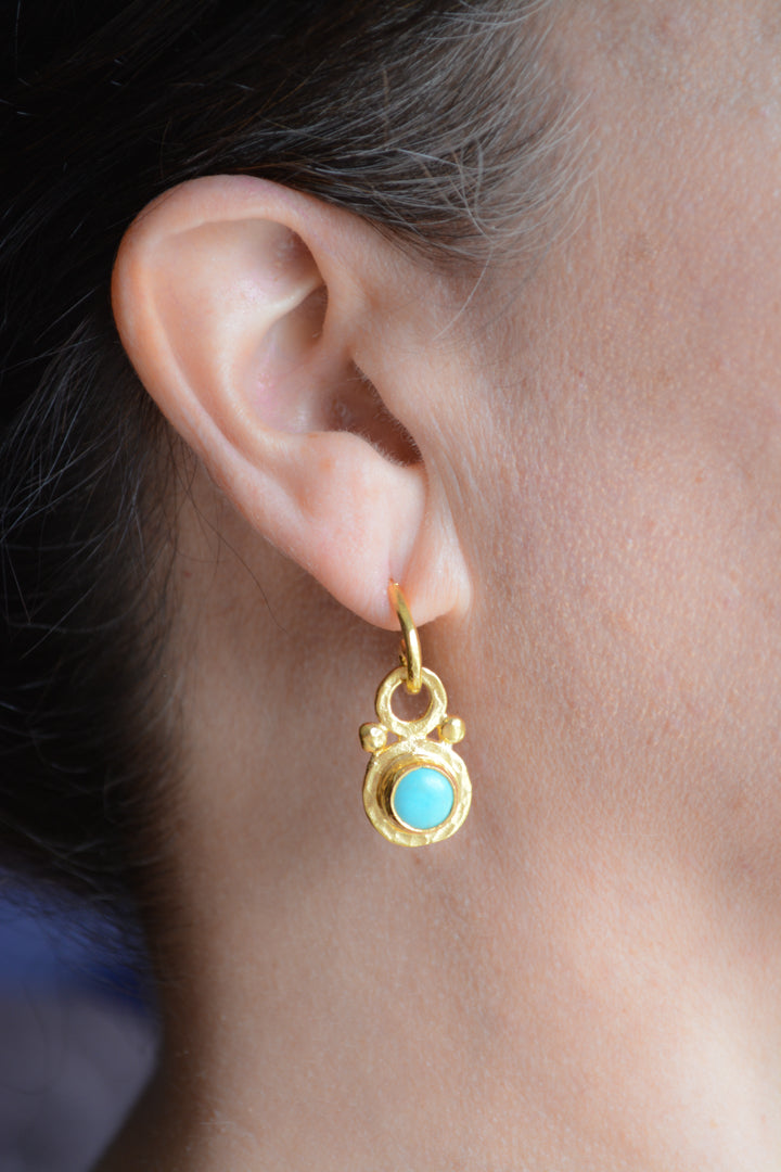 Experience the perfect blend of vibrancy and elegance with our Turquoise "door knocker" earrings. The vibrant turquoise pairs beautifully with the rich gold color, adding a touch of liveliness to any outfit. Crafted from brass with 22k gold plating, these 1 1/4" earrings are light and easy to wear, making them a must-have addition to your jewelry collection.