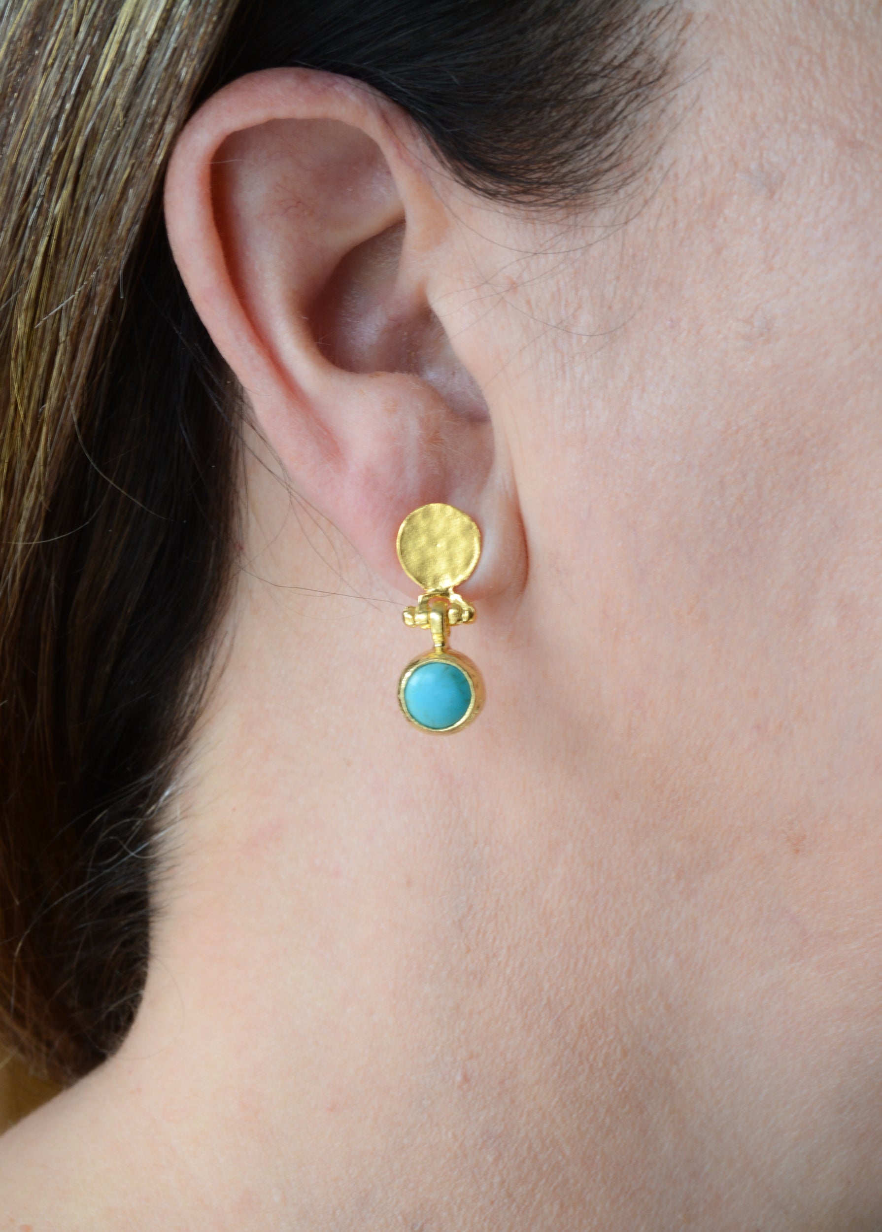 Hand hammered post earring, brass with turquoise, and 22kt gold plating. 1" length. Perfect size and shape for daily wear, or whenever you need a pop of color.