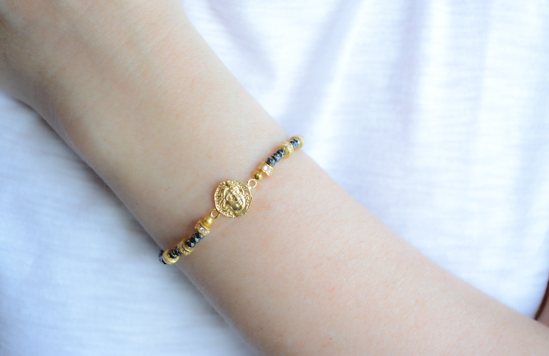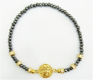 This bracelet is composed of sterling silver plated in 22kt gold and adorned with genuine hematite and cubic zirconia accents. It features two side Roman coins and is designed with a stretch fit to accommodate most wrist sizes.