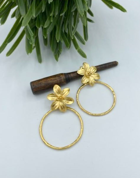 These Flower door knocker hoop earrings feature a post and are crafted with brass, plated with 22k gold. They have a length of 2 1/4".