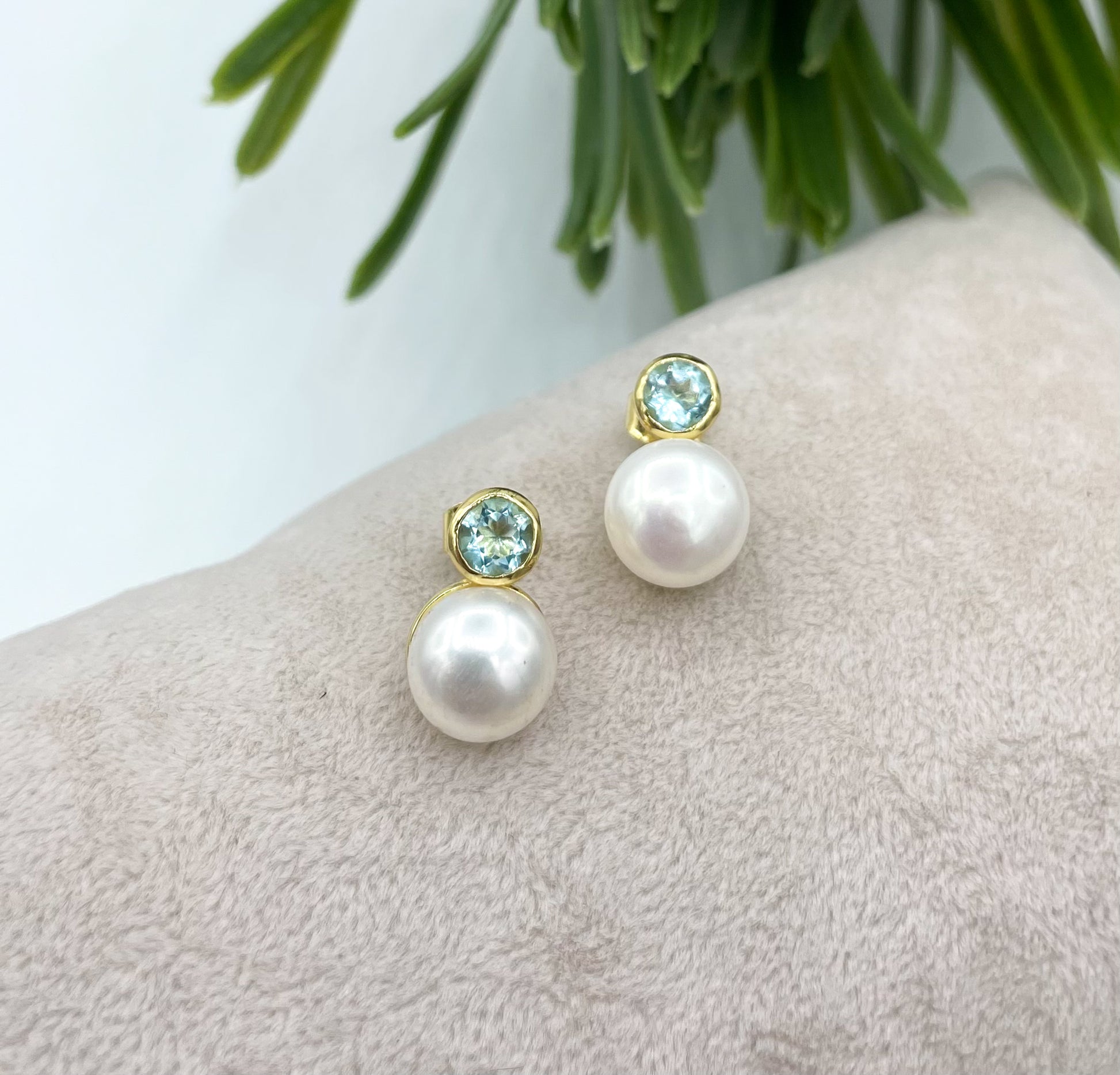 These timeless earrings feature 22kt gold plated brass with pearl and faceted blue topaz for everyday wear. Their length is 1/2".