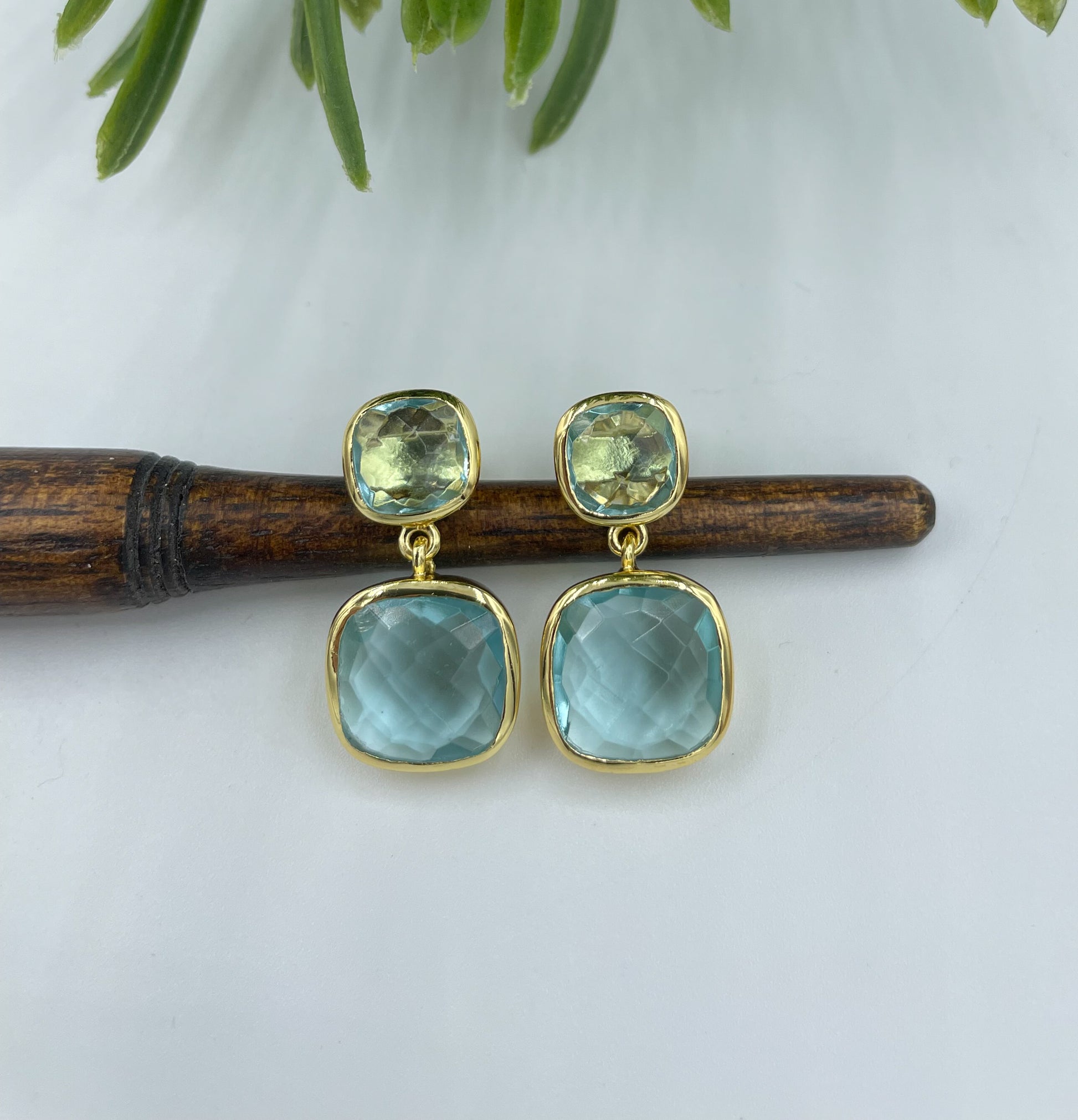 These 22k gold-plated brass earrings feature a double-drop design with cushion-cut faceted blue topaz. Ideal for all-season wear, they measure 1" in length.