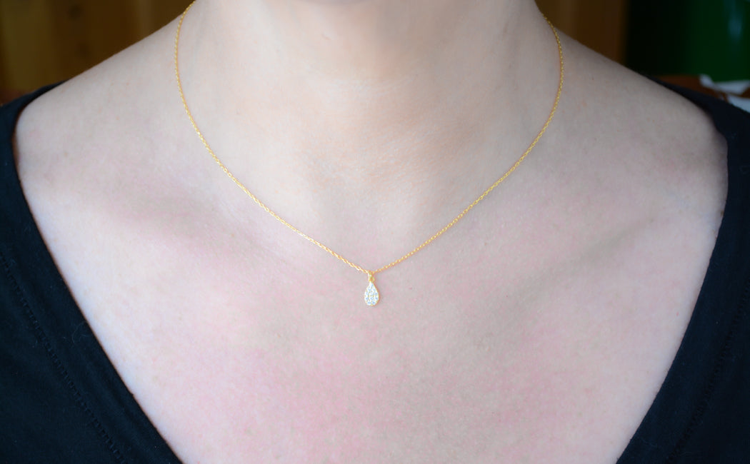 This dainty and delicate teardrop necklace is made with sterling silver and pave set cubic zirconia, and plated in 22kt gold. Teardrop is approximately 1/4" long, necklace is adjustable 16-18". The perfect way to add a touch of sparkle to your ensemble. A subtle yet stunning statement piece.