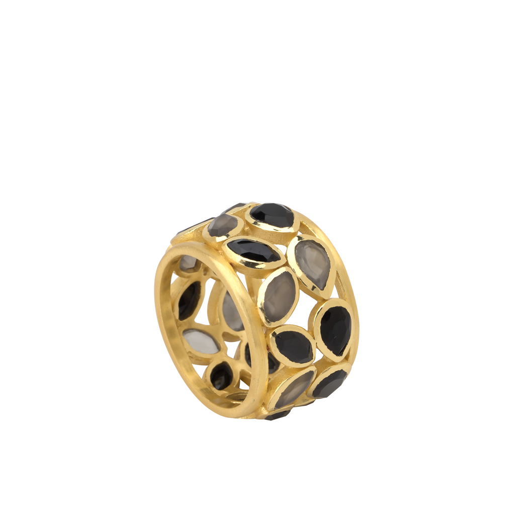 This 22kt gold electroplated brass band ring features a matte gold finish with grey moonstone and onyx gems secured in small leaf shaped settings.
