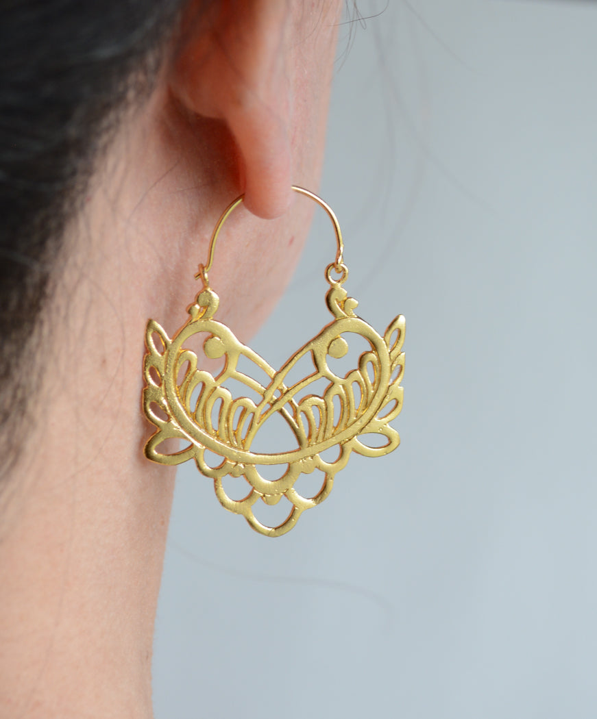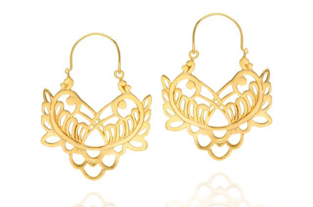 These beautiful gold plated ornate filigree hoop earrings boast an intricate design and elegant motif. Crafted from brass with 22kt gold plating, each earring measures 2" x 1 3/4" for a lovely addition to any wardrobe.