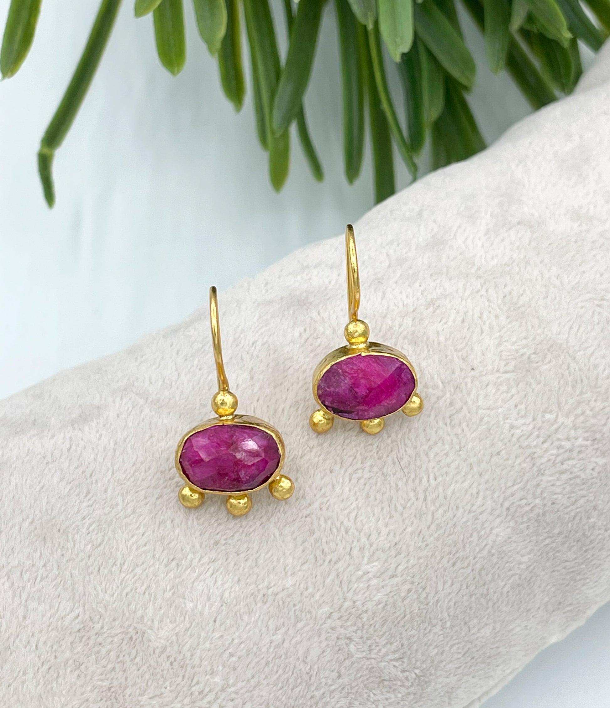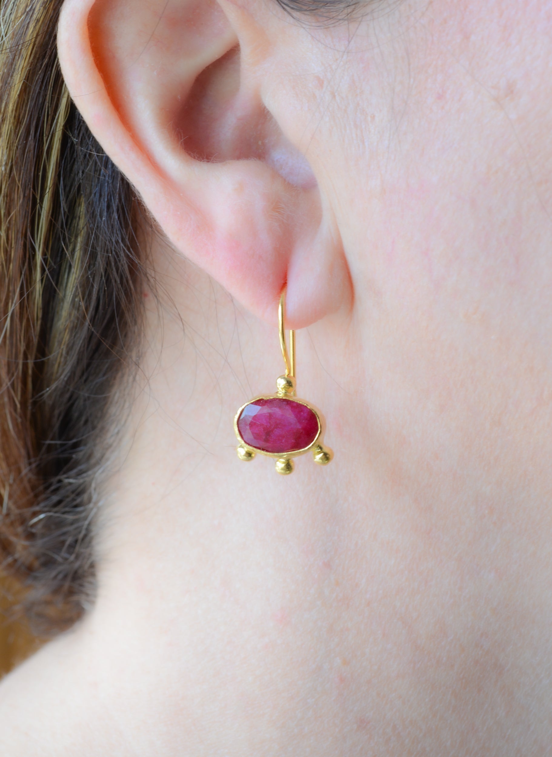 Gold plated rough cut ruby dangle earrings