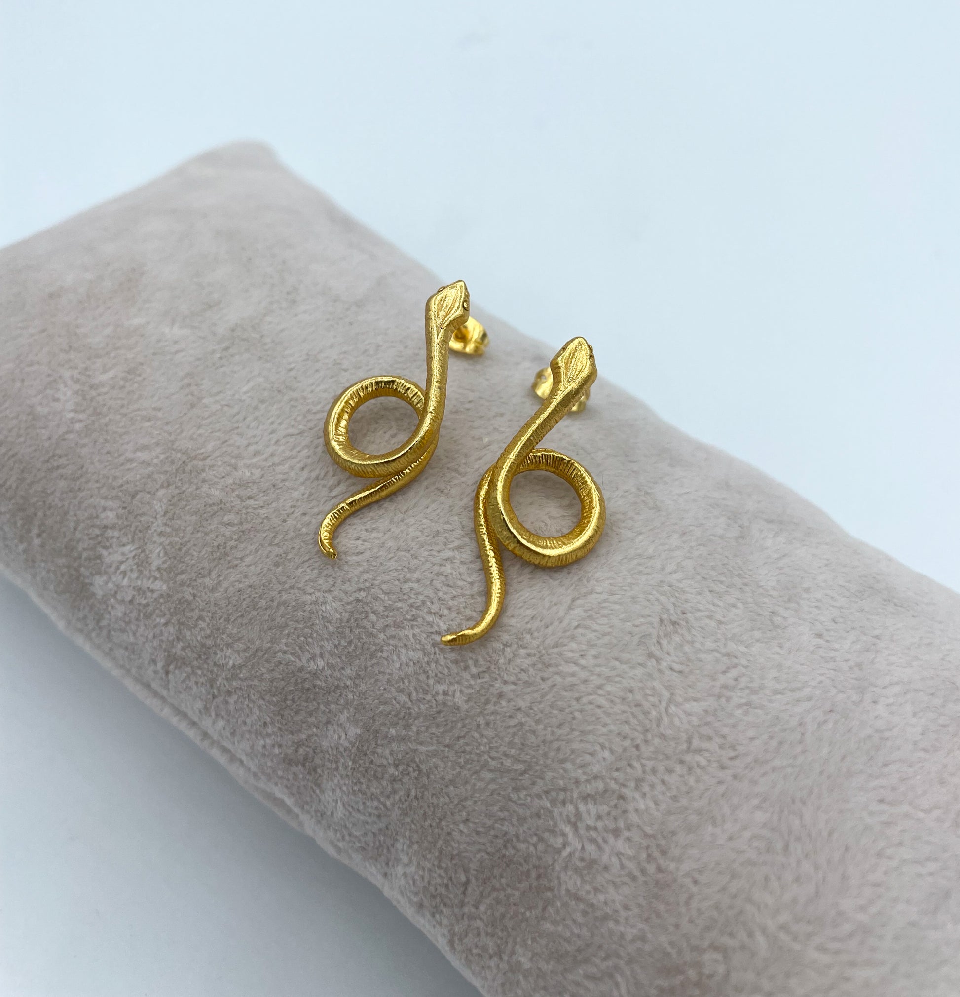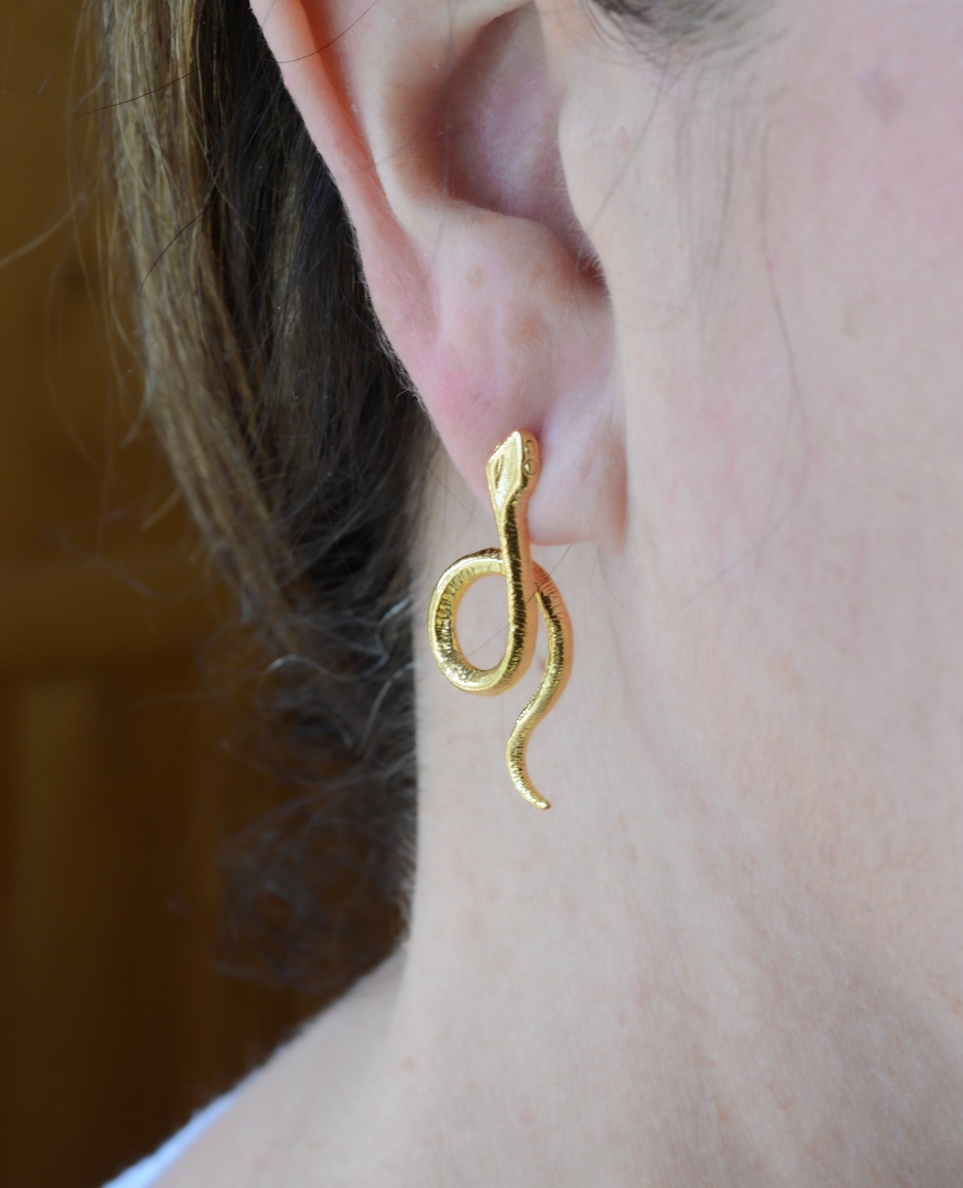 Our edgy serpent earrings feature 22 karat gold plating on a brass base. The matte finish with texture adds luxurious vibes, and its length is 1 1/4" long.