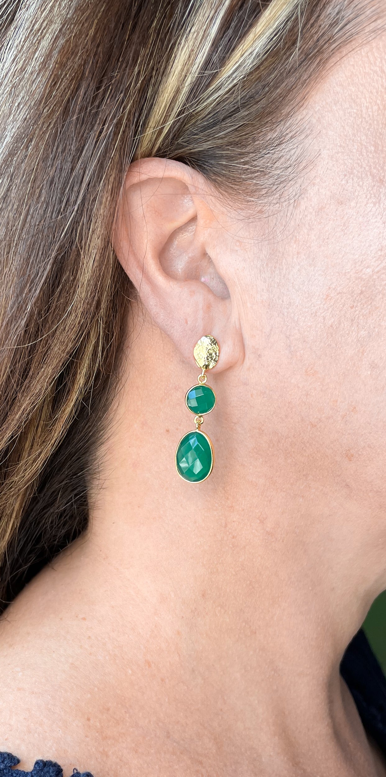 These Green Onyx Double Drop Earrings are a timeless and elegant addition to any wardrobe. Crafted of brass and plated with 22kt gold, these earrings measure approximately 2" in length. The unique green onyx adds subtle flair, making them the perfect accessory for any occasion.