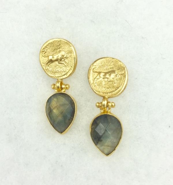 These 22k gold-plated brass earrings are an exquisite combination of labradorite and a replica of an ancient Roman coin, to create a timeless statement piece. Carefully crafted to a length of 1.5 inches, these earrings bring a captivating luxury to any look.