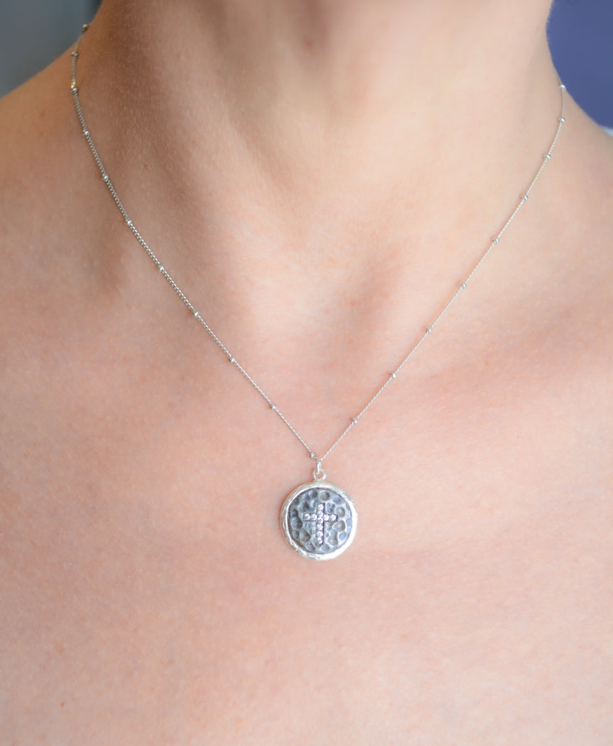 This stylish pendant necklace features a cubic zirconia cross set in a hammered bronze bezel with sterling silver accents and finished with a rhodium plating. The necklace has a total length of 16" plus 2" of additional chain.
