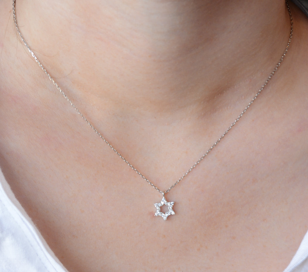 This dainty and delicate Star Of David necklace is made with sterling silver and pave set cubic zirconia, and plated in rhodium.